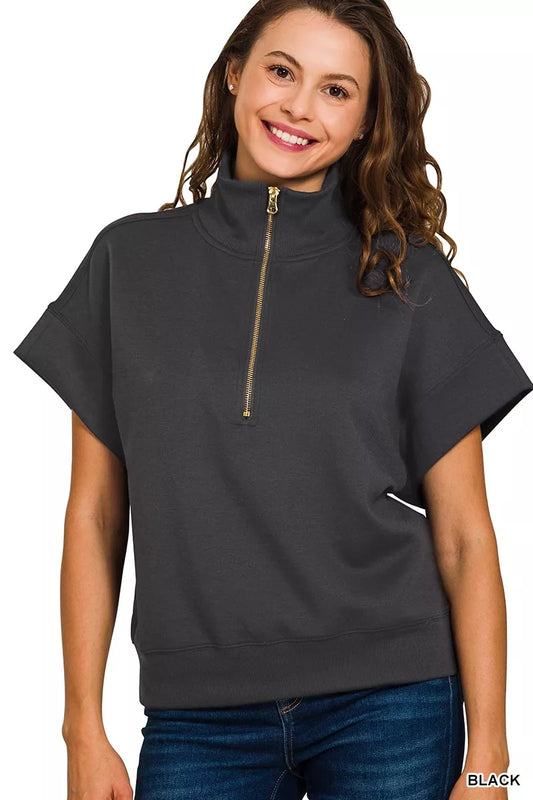 Zenana Scuba High Neck Half Zip Short Sleeve Top