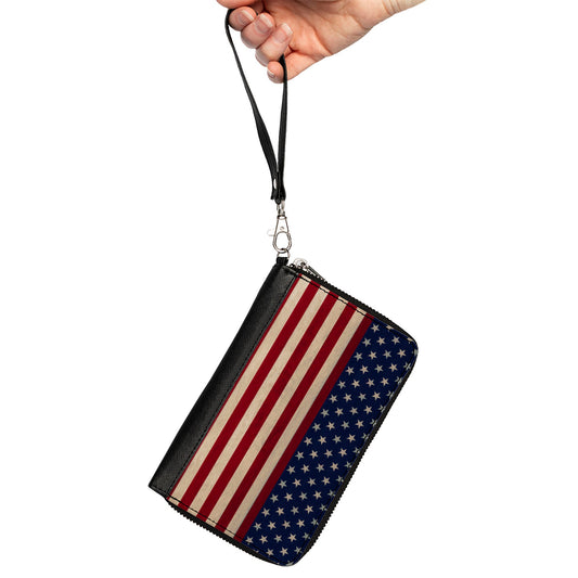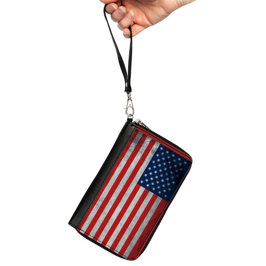 PU Zip Around Wallet Rectangle - American Flag Distressed Single