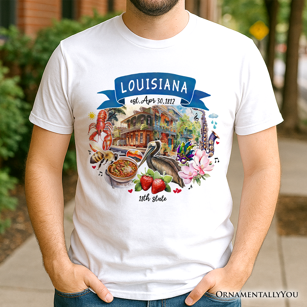 Celebrate the vibrant charm and heritage of the Pelican State with this eye-catching t-shirt featuring artistic illustrations of iconic Louisiana landmarks and cultural symbols. From the historic streets of New Orleans to the mighty Mississippi River, this tee brings the soul of Louisiana to life with every detail. Perfect for travelers, history buffs, and anyone with a love for Creole flair, jazz, bayous, and Southern pride 🎷🌿🛶. Soft, breathable, and stylish, it's a meaningful gift or personal souvenir that speaks to the spirit of exploration and state pride.