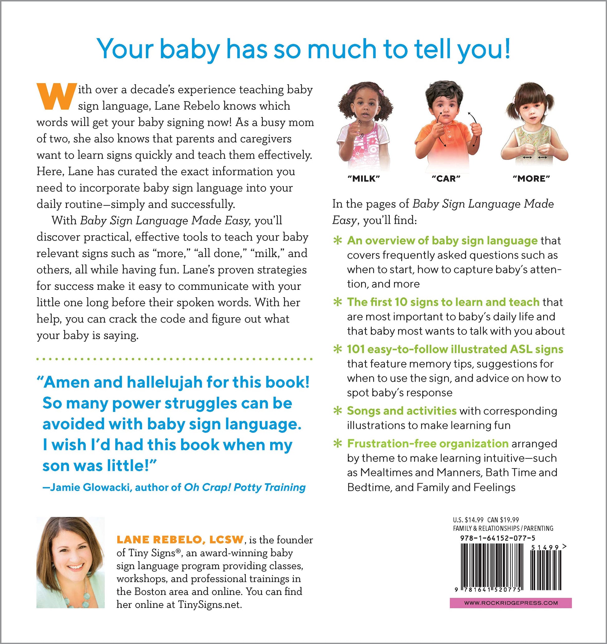 Baby Sign Language Made Easy is filled with 101 useful, everyday ASL signs and a clear, simple format that explains what signs are best to start with and tips for teaching them. Whether it’s asking for milk or telling you that they’re tired, you’ll learn how to give your baby the tools to tell you what they’re thinking.