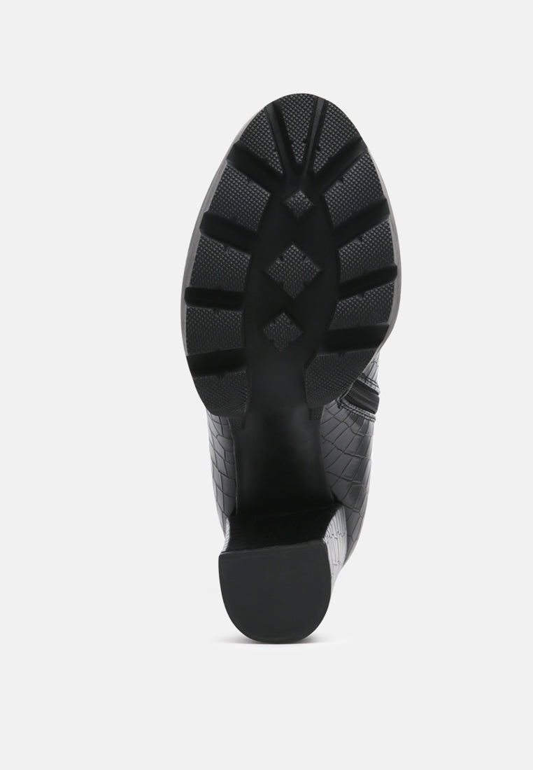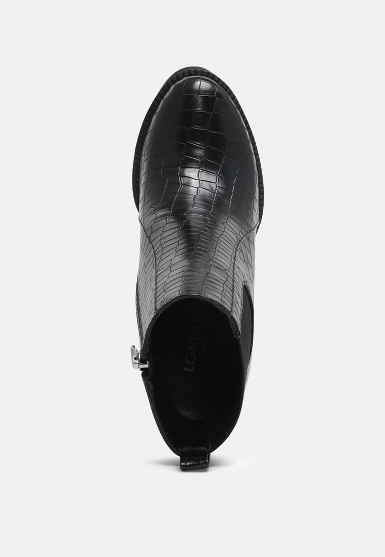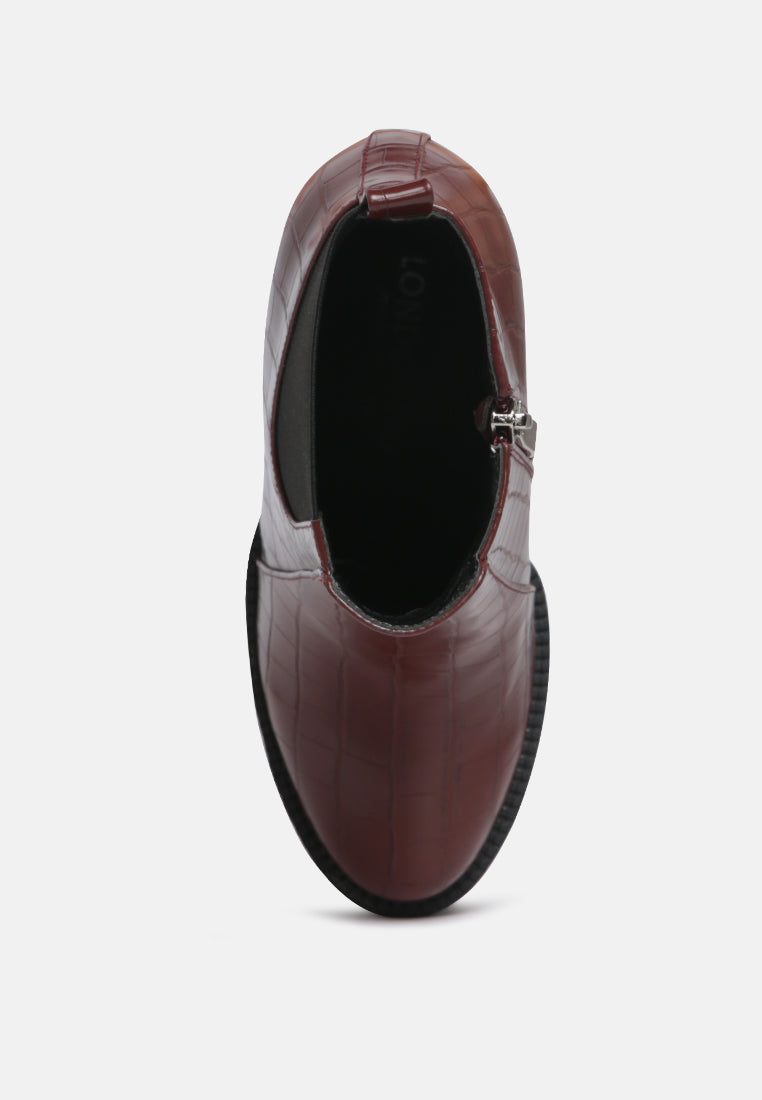 Make sure your wardrobe is new season-ready and indulge in a pair of simplistic block heel ankle boots. Showcasing a croc print with a round-toe design & zip closure along with a back pull tab for convenient wear. Complete your look by wearing these block heel ankle boots with a mini dress. It's a perfect wear for a camping night this festive season