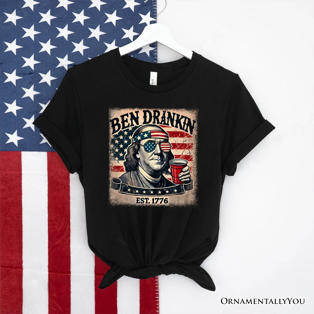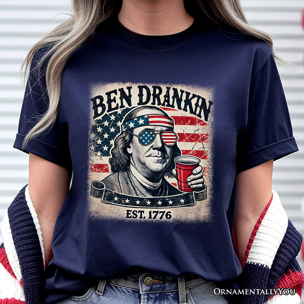 Ben Drankin Funny 4th of July T-Shirt, White, Navy and Black Patriotic Tee With Benjamin Franklin