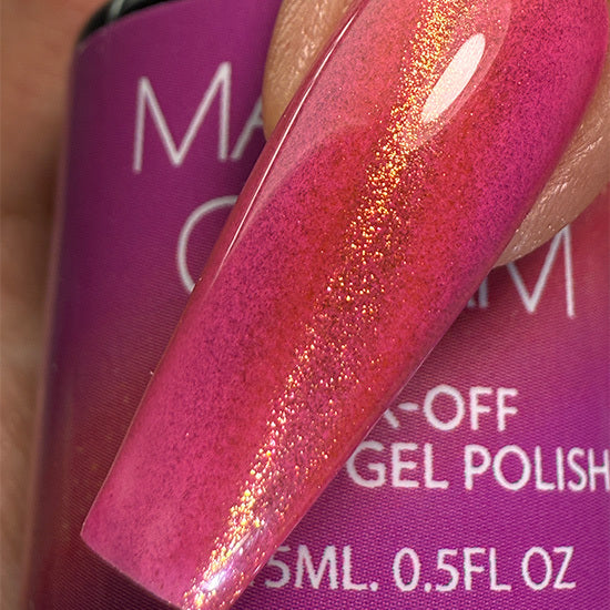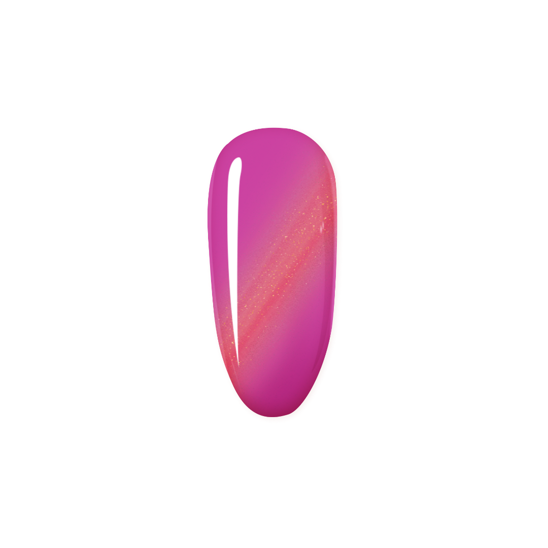Bring energy to your nails with this dynamic fuchsia cat eye polish, sprinkled with shimmering red specks. It’s bold, bright, and ready to spark any conversation.