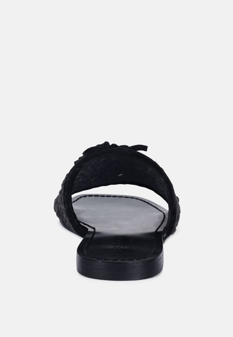The Classic summer flats with 100% Natural cotton woven structure with soft suede frame detail and the tassels at the top. The square toe open slides are casual, comfort shoes from Rag & Co.