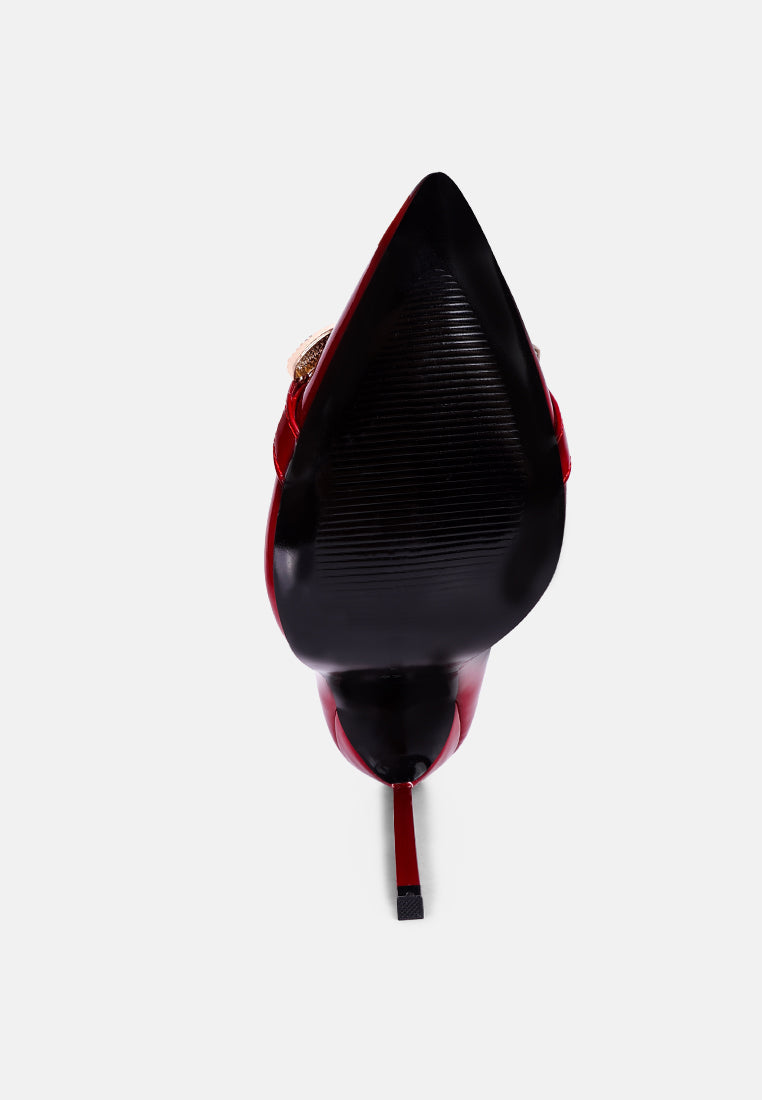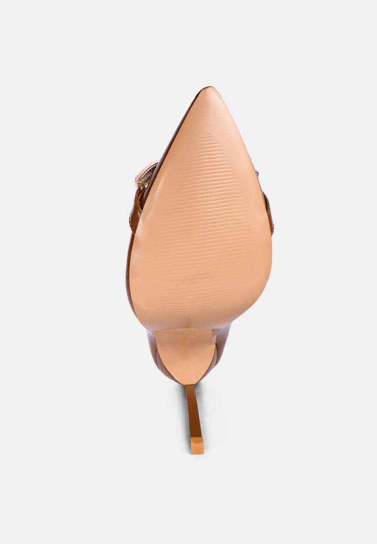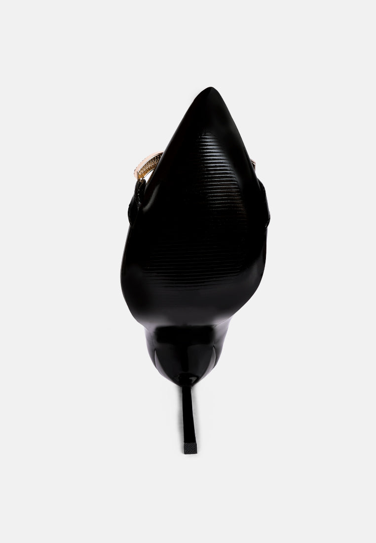 The shoes are sleek, slender, and chic with the touch of rhinestone and gold embellishment on the front which elevates the whole look of the sandals. The pump shoes have cushion padded innersole that offers comfort and cuts strain. The style is a classic and would look lovely as wedding heels on a bride or even bridesmaid shoes.