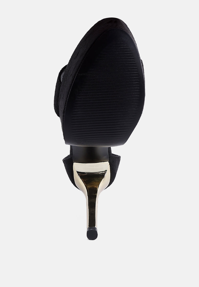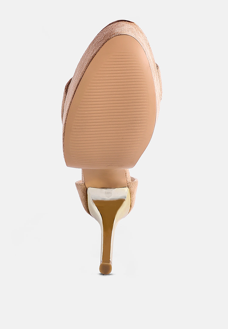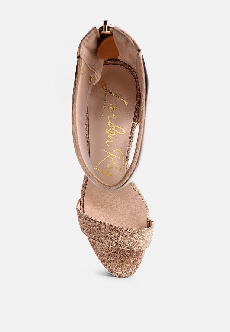 Sky High Bling Heel Sandals in microfiber with metallic detail band on the ankle - these statement sandals come with back zipper opening and look gorgeous on feet.