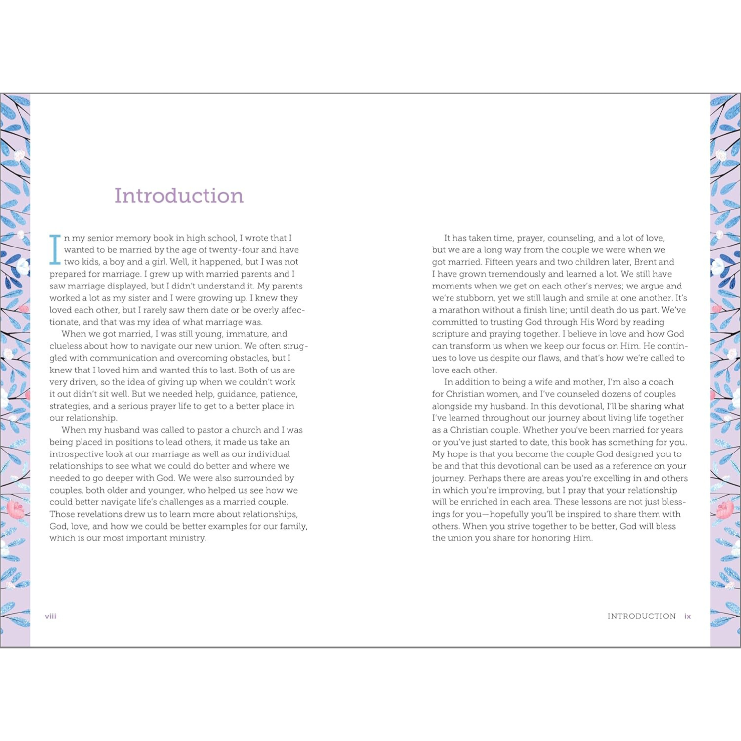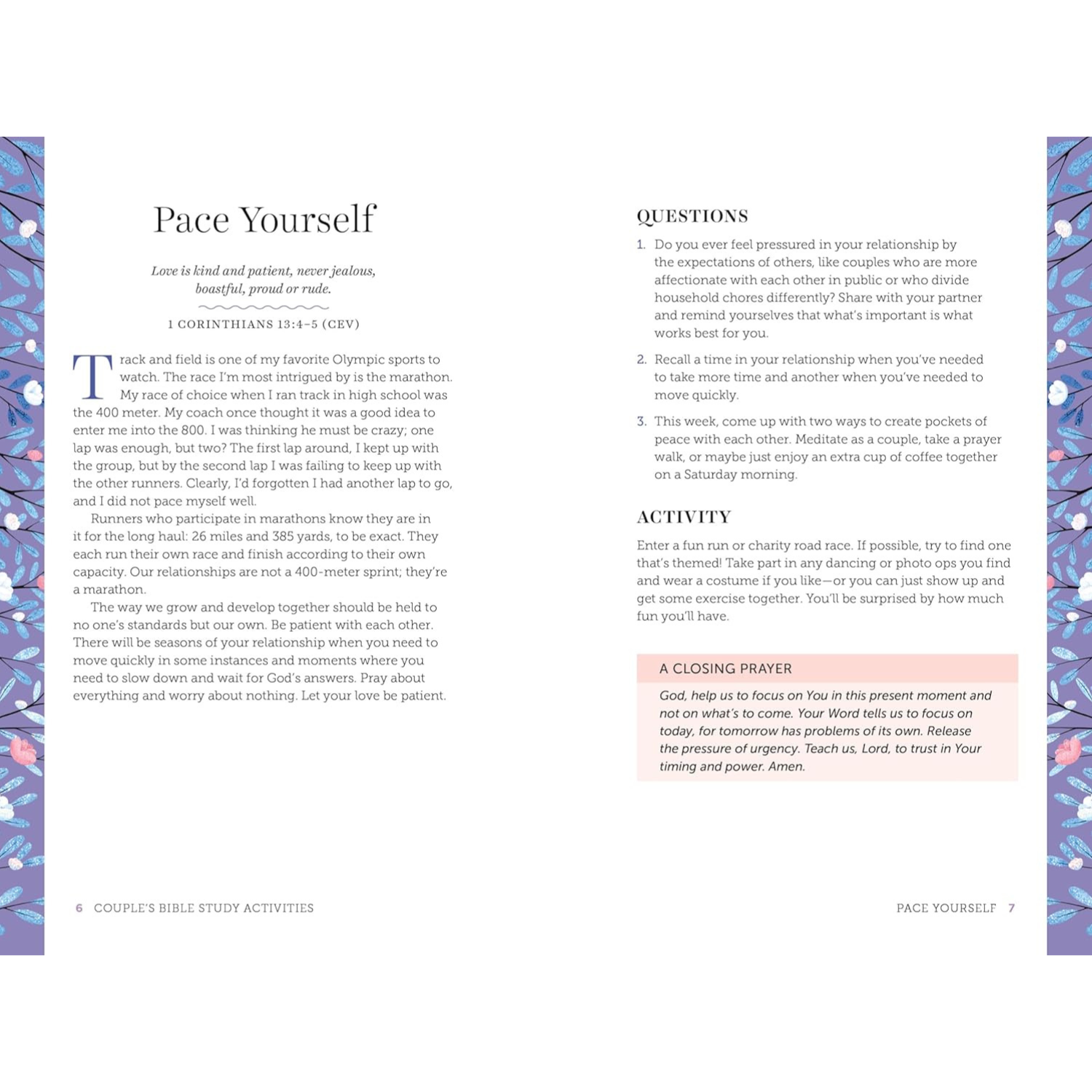 - Themes for couples—Discover devotions that touch on topics important to couples, like communication, faithfulness, patience, and putting God first in your relationship.