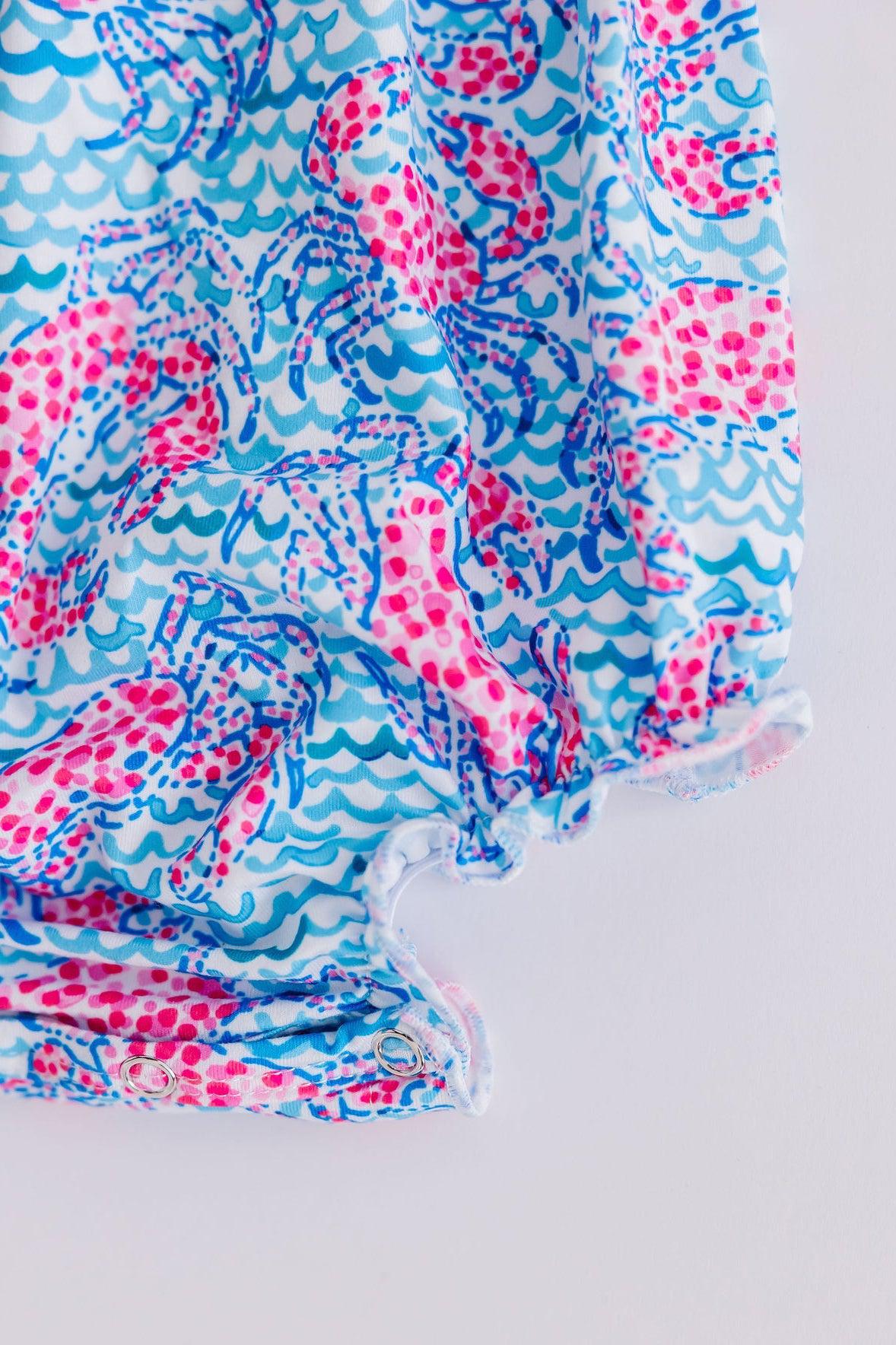 Our Ruffle Cross Back Romper is perfect for summer! Straps criss cross in the back with a sweet ruffle on the shoulder. Snaps for easy diaper changes.