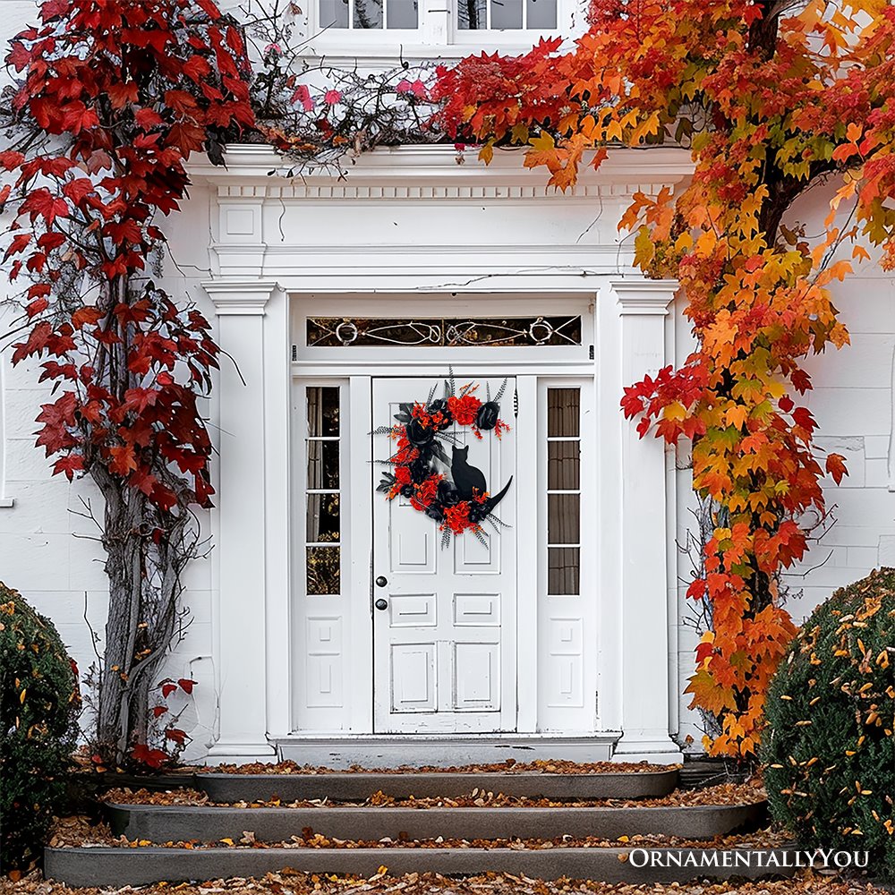 Crescent Moon Floral Black Cat Wreath, 20" Black and Orange Halloween Door Decoration