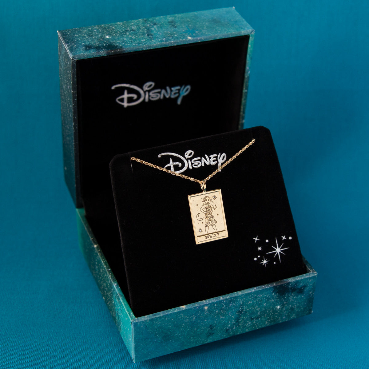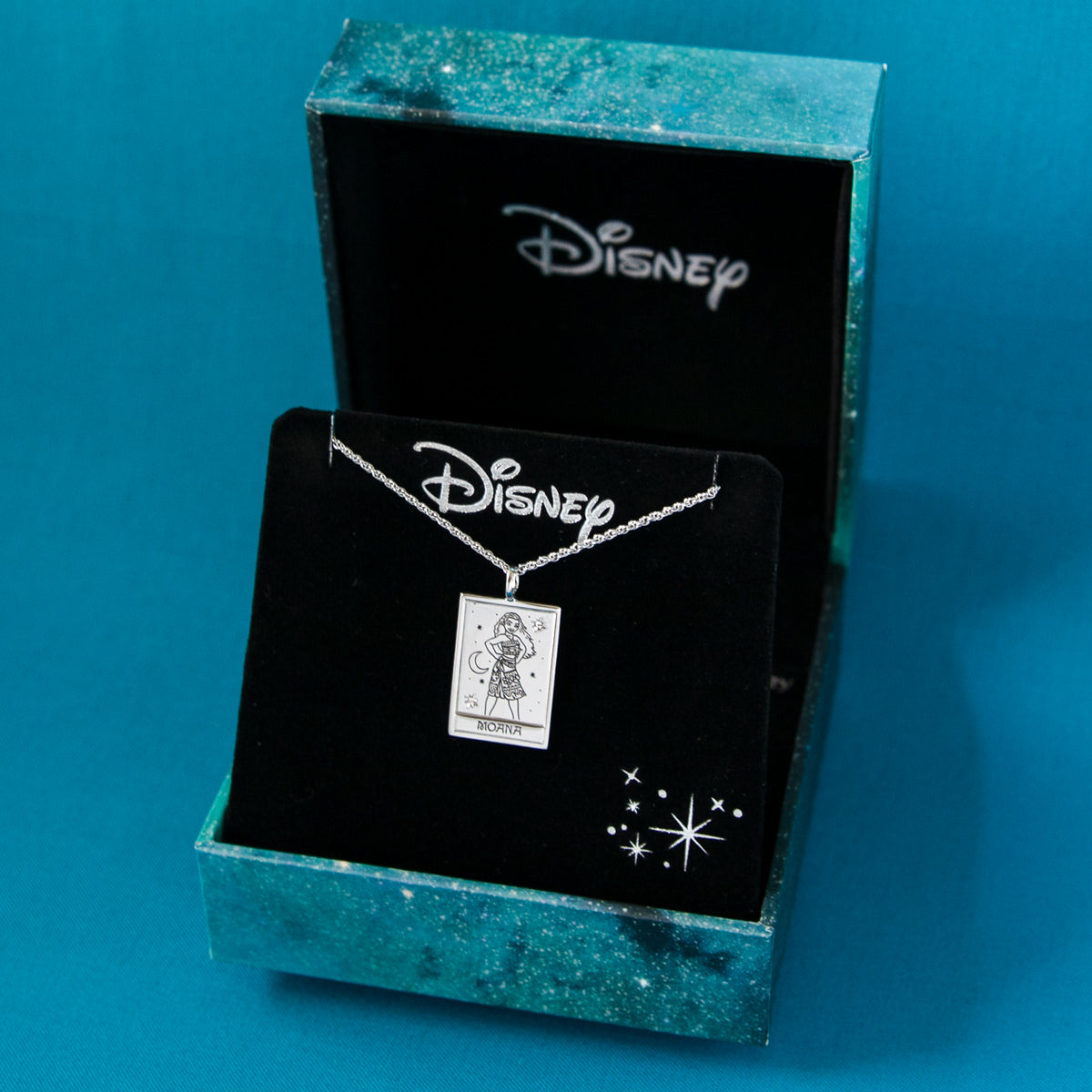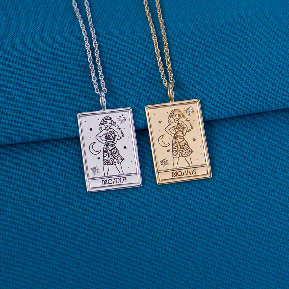 Sparkle with the stars with Disney | RockLove’s Celestial Tablet Collection! Handcrafted in solid sterling silver, this petite feminine pendant features an engraved portrait of Princess Moana from Disney’s Moana. Inspired by zodiac jewelry, Moana’s name frames the bottom of the rectangular charm, and she is encircled by a raised crescent moon and etched starbursts accented by glittering white cubic zirconia crystals. The stylish necklace is perfect for layering, with three points of attachment along the adjustable sterling silver rope chain to perfectly customize length. Complete with signature tag and graceful extender weight.
