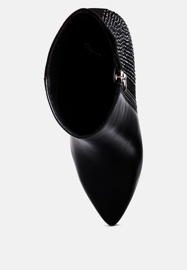 Looking to Dazzle tonight? Our Encanto High Heeled Ankle Boots are just where your search ends. These girls boots have rhinestone detail at the back, on the heel, and on the platform, making it a knock out pair. A lightly padded insole makes it comfortable to wear, all day or night long. These high heeled closed pointed toe boots can be paired up with a nice dress or skinny jeans making the Devil itself bow down to this Diva.