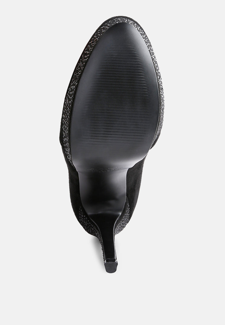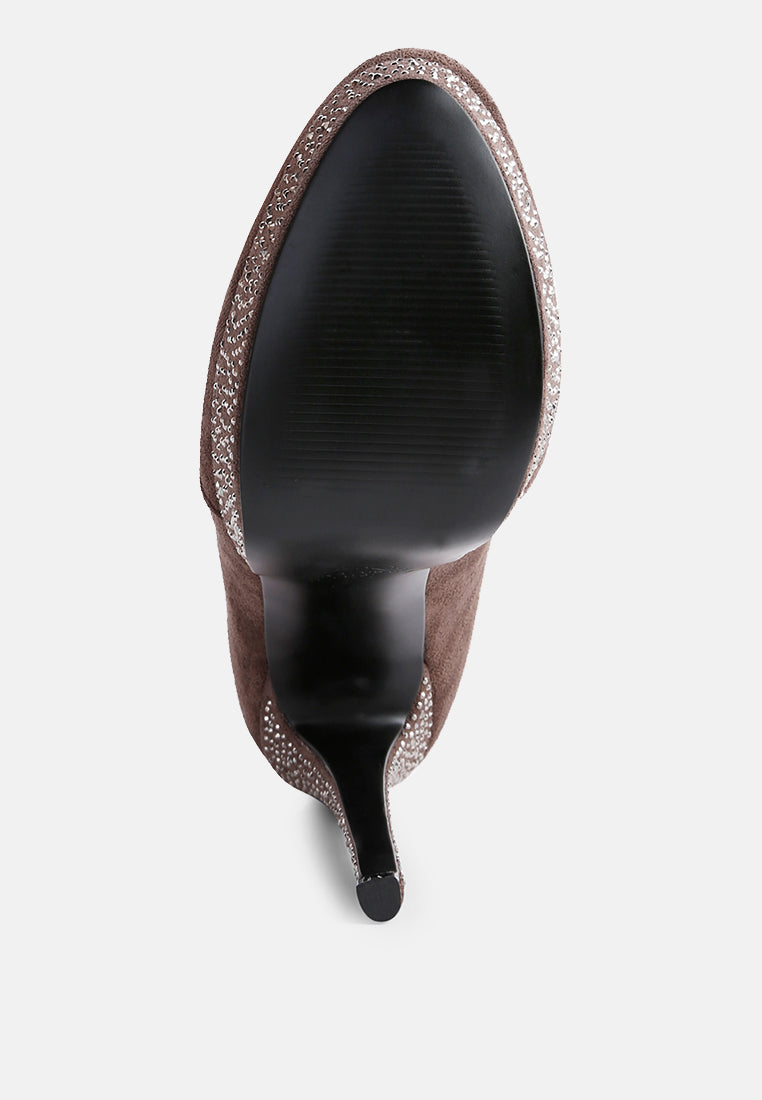 Espiree Microfiber High Heeled Ankle Boots are rhinestone boots that enhance your look in two shakes of a lamb's tail. These girls boots have front panelling and a back zipper for optimum comfort. These high heeled boots give you perfect elevation and come in various colors, so an outfit mismatch is out of the question. A lightly padded insole gives you the comfort of running on clouds. A perfect stunner for a Stunning Diva.