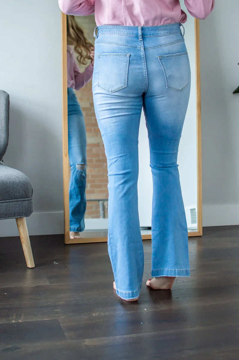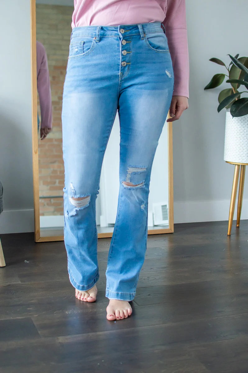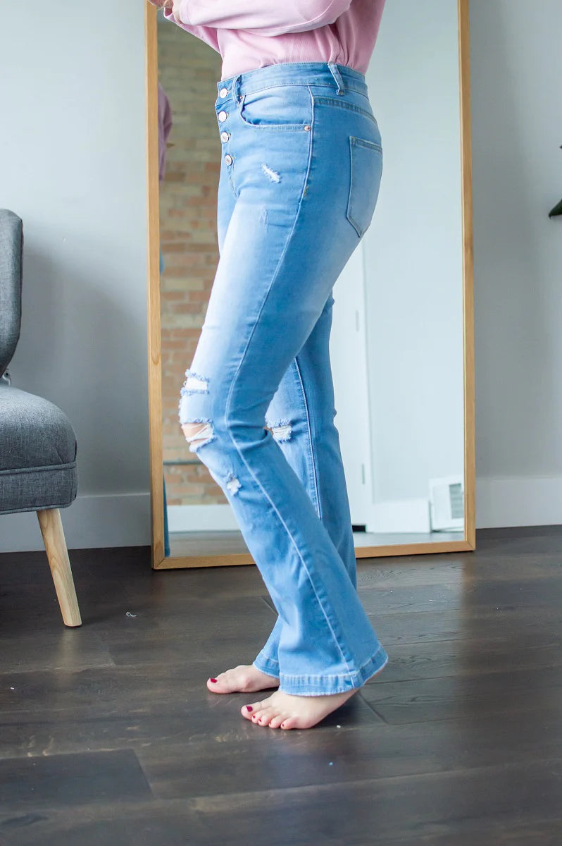 These high waisted flare jeans are perfect for any occasion! The adorable button fly waist and slight distressing gives these the perfect amount of detail for an every day pair of flare jeans! Wear them on a date or on a casual outing!