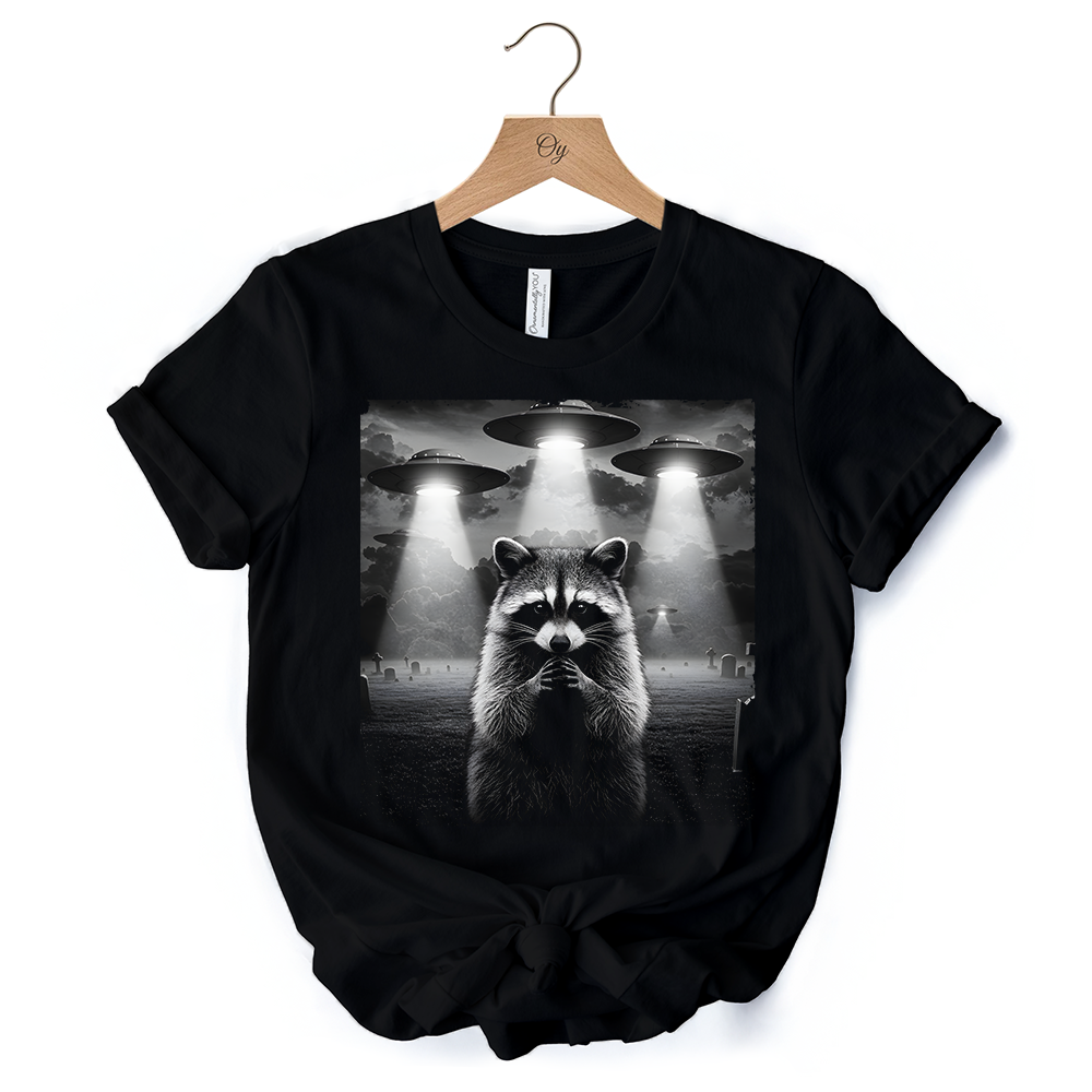 Funny Raccoon UFO T-Shirt, Unisex Black Tee for Space Lover