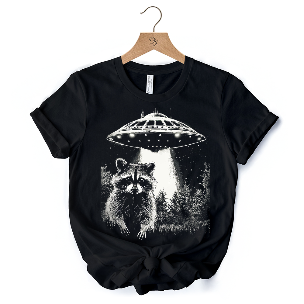 Add a touch of cosmic mischief to your wardrobe with this hilarious black unisex tee featuring a cheeky raccoon caught in a UFO beam! 🛸🦝 Perfect for alien lovers, conspiracy theorists, and anyone with a love for offbeat humor, this comfy and durable shirt blends extraterrestrial fun with raccoon chaos in a bold, retro design. Whether you're heading to a sci-fi convention, hanging out under the stars, or just showing off your quirky style, this tee is an out-of-this-world conversation starter 👽✨.