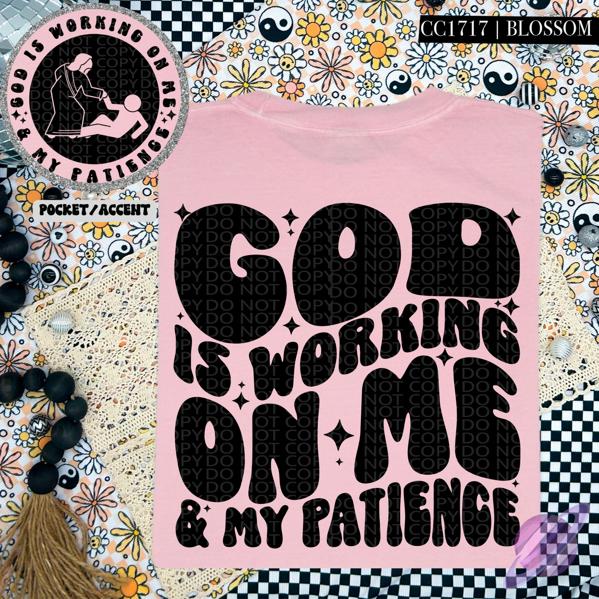 GOD IS WORKING ON ME PATIENCE - POCKET PRINT DOUBLE SIDED TEE