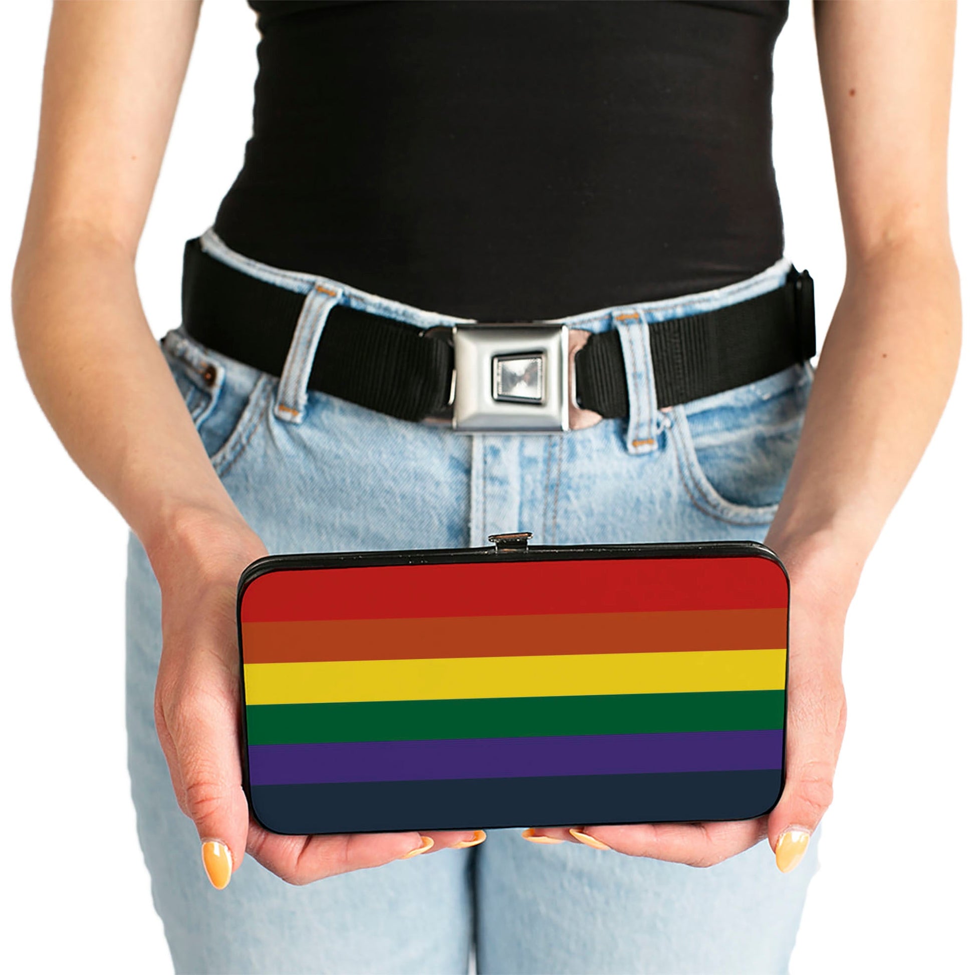 - Women's Hinged Wallet measuring 7.0x4.0x0.75 Inches, with 2 billfolds, 4 card slots, and a windowed ID holder.