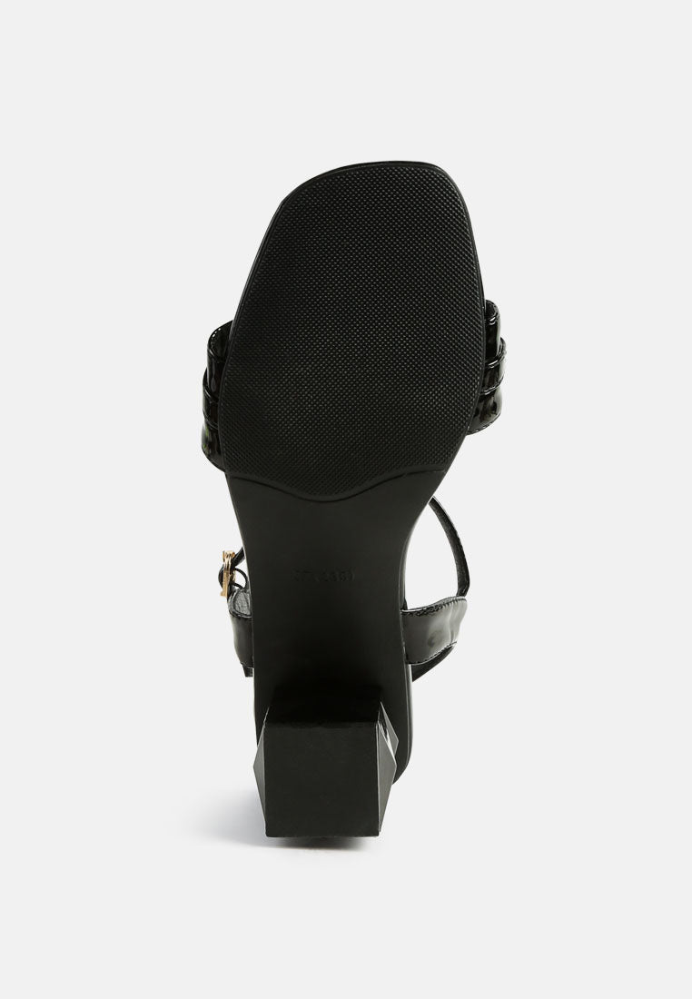 The block-heeled sandals are beautifully detailed with an illusionary rock-cut design, offering both comfort and style with mid-heel construction. These premium partywear sandals are constructed with precision and boast a superb finish, featuring a metal gold chain with rhinestone embellishments on the vamp.