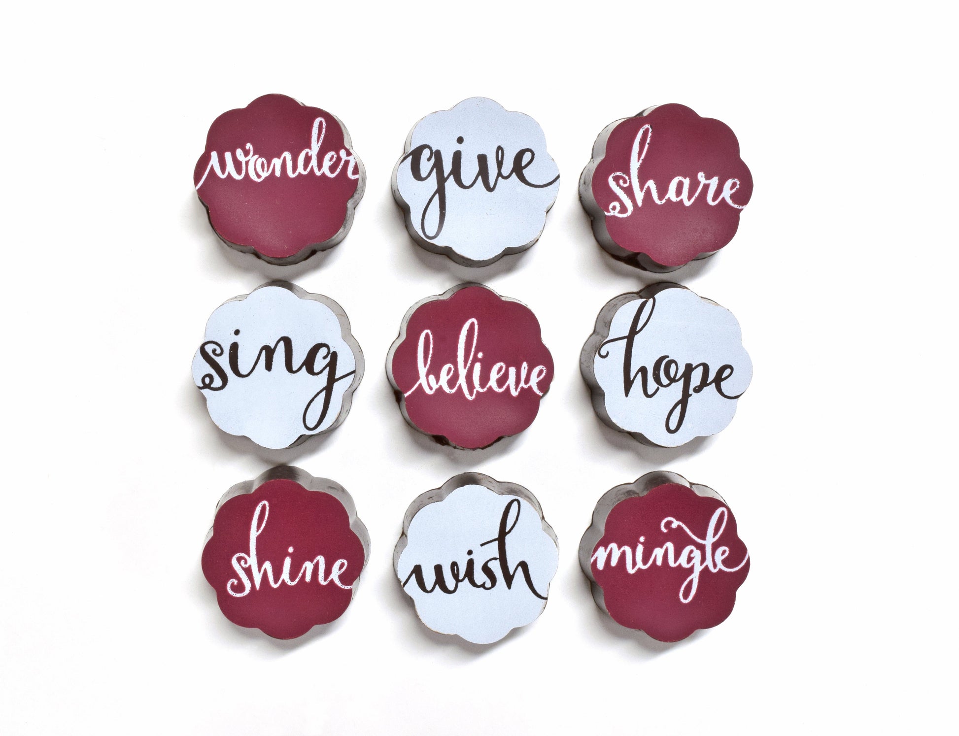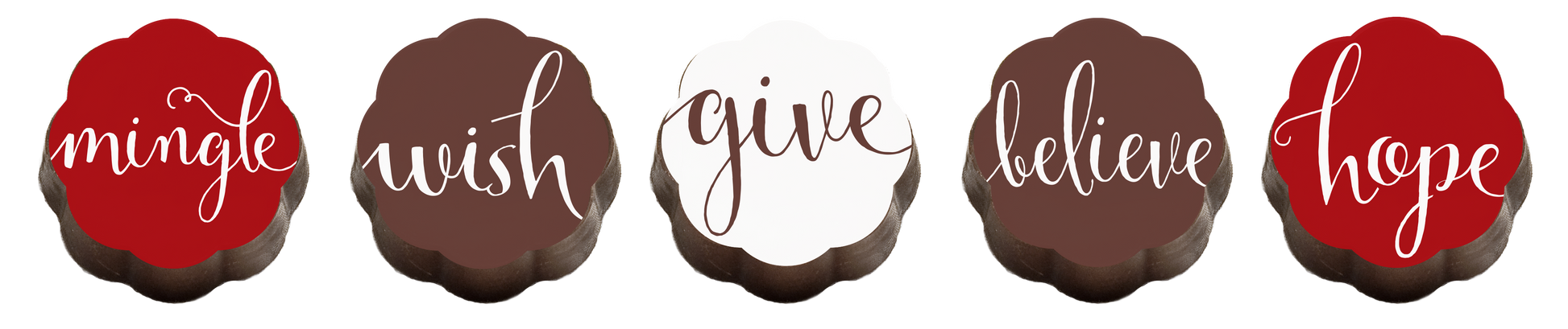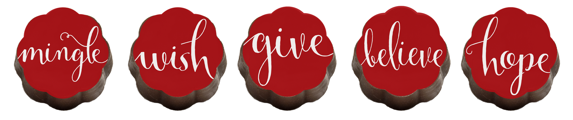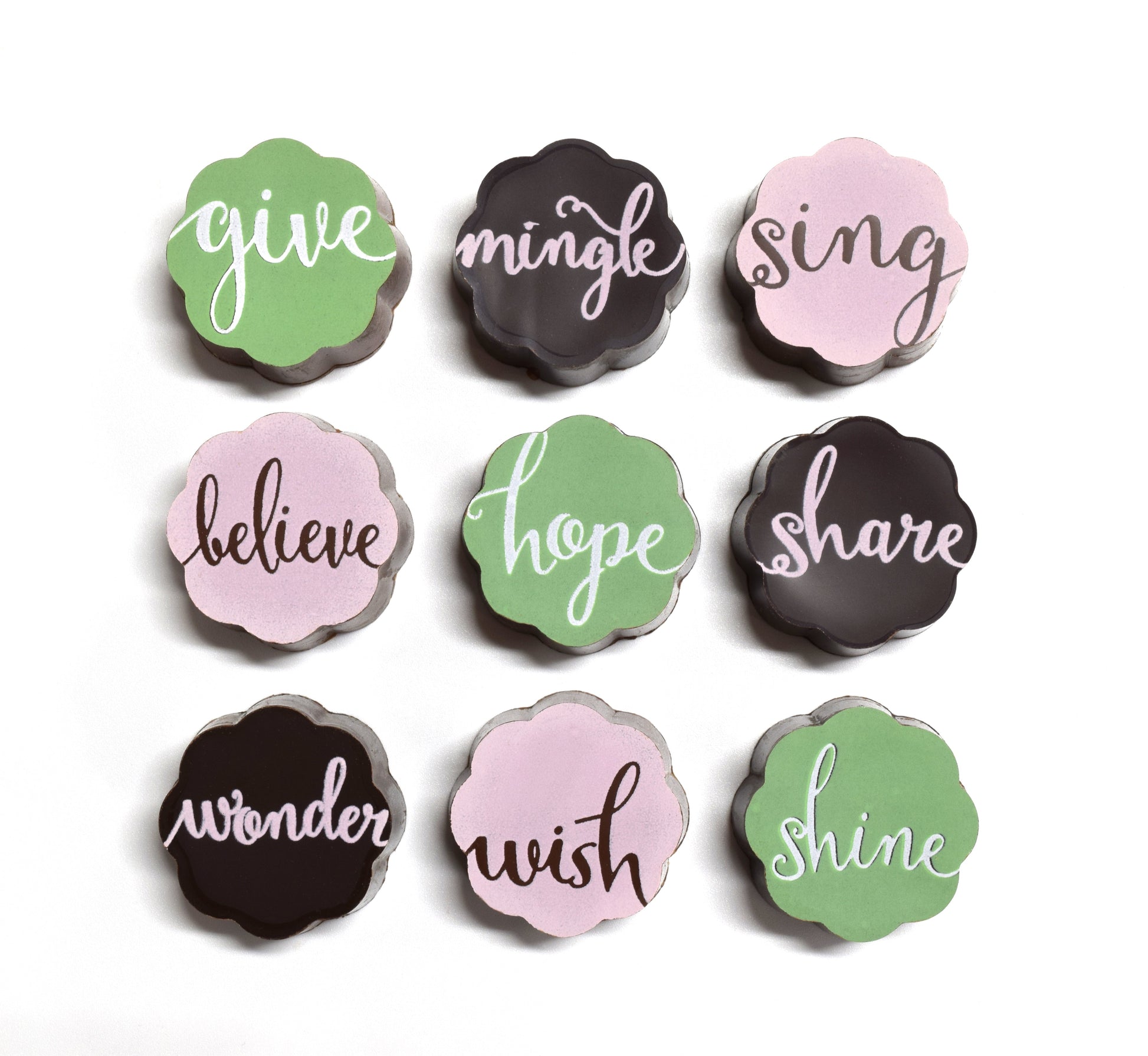 Soft White: Four chocolates showcase a soft white top, with empowering words written in a charming burgundy script. These include: "give," "sing," "hope," and "wish."