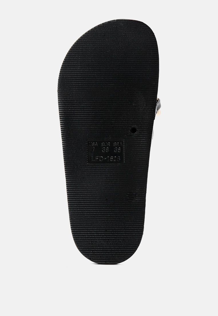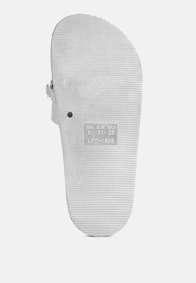 The molded footbed, comfortable platform, and gripping outsole are what make these otherwise beautiful metallic high bling slides utilitarian.