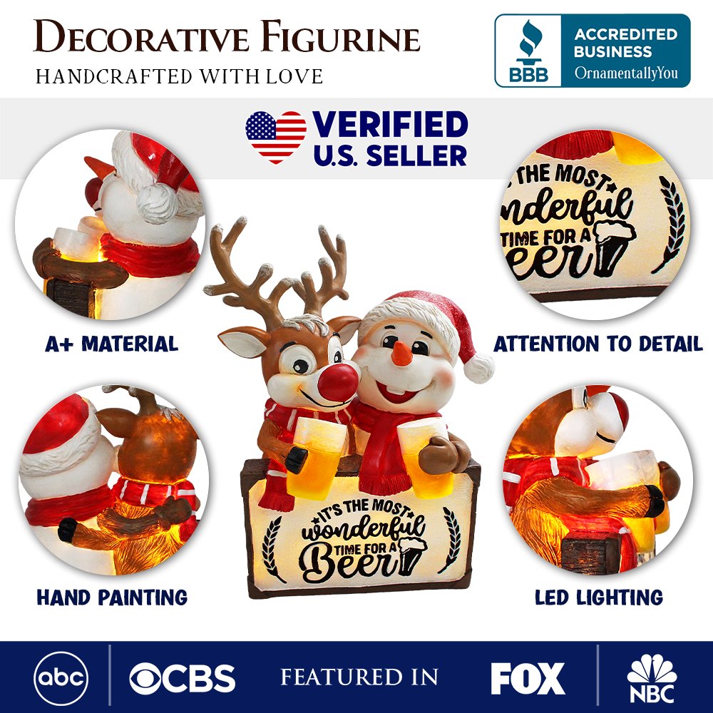 It's the Most Wonderful Time for a Beer Festive Figurine, 8" Snowman and Reindeer Christmas Party Statue