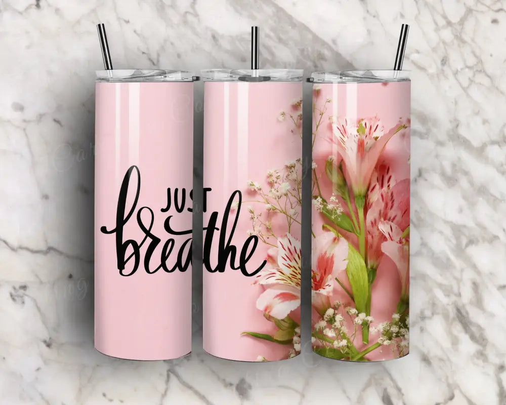 Unleash your inner explorer with Just Breathe - Pink. Featuring a durable tumbler design, this product is adorned with beautiful pink lilies and the motivational phrase "Just Breathe." Stay hydrated and reignite your sense of adventure with this inspiring tumbler.