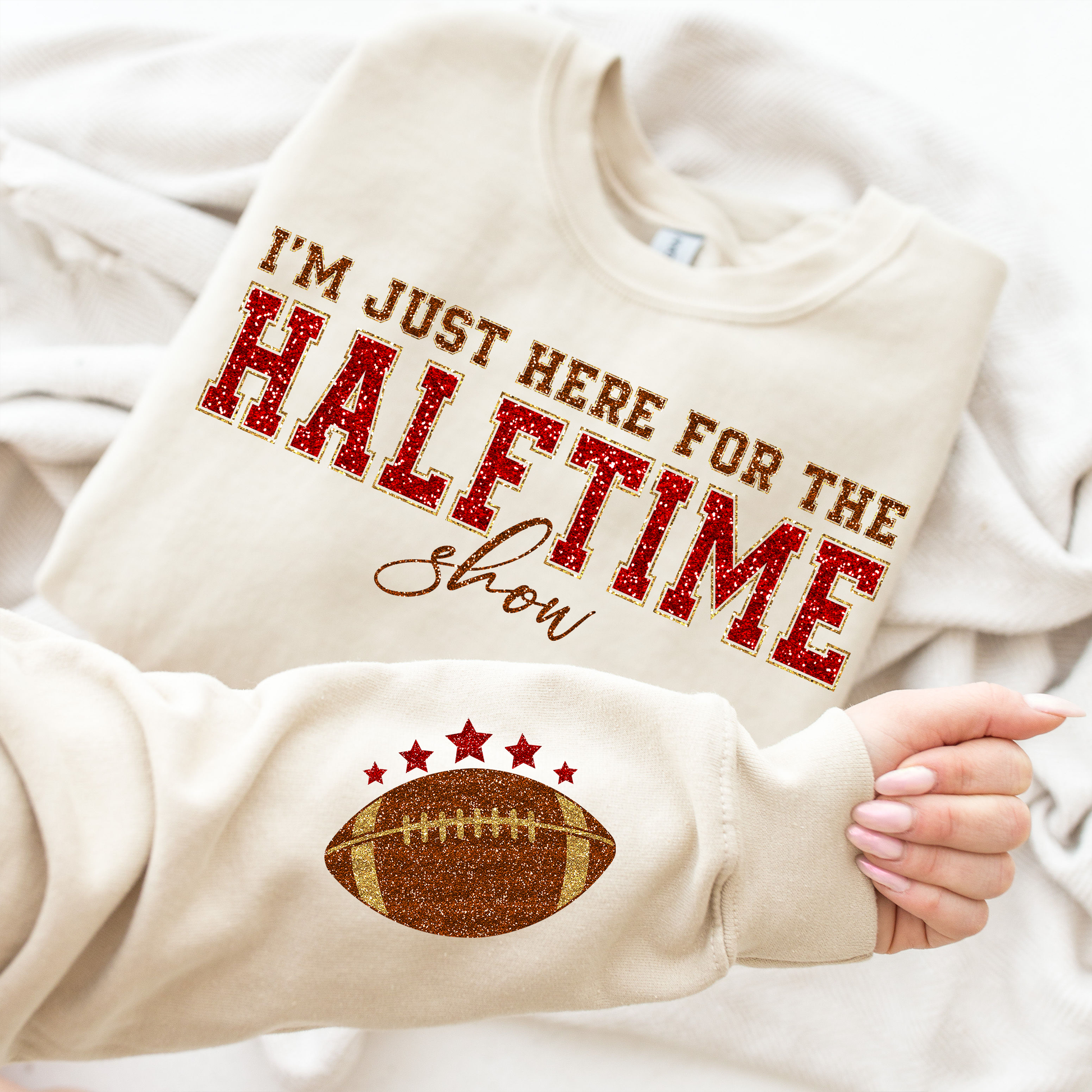 Score big on style with our "I'm Just Here for the Halftime Show" sweatshirt, perfect for Super Bowl season! Whether you're tuning in for the touchdowns or just the halftime magic, this cozy, unisex crewneck has you covered in glittering charm. Featuring bold red and gold accents with a fun football sleeve detail, it's the ultimate game-day statement piece. Comfort meets sparkle—because who says halftime can't be your time to shine? Grab yours now and make your Super Bowl party outfit a total touchdown! 🏈✨