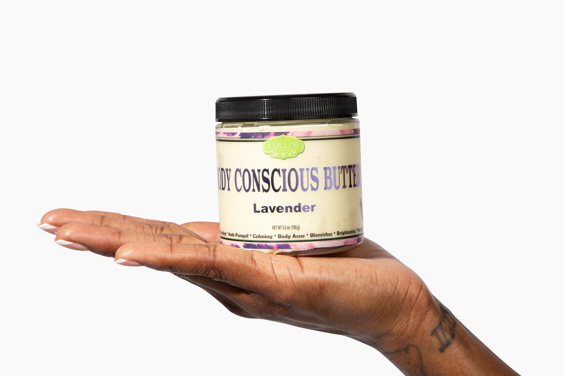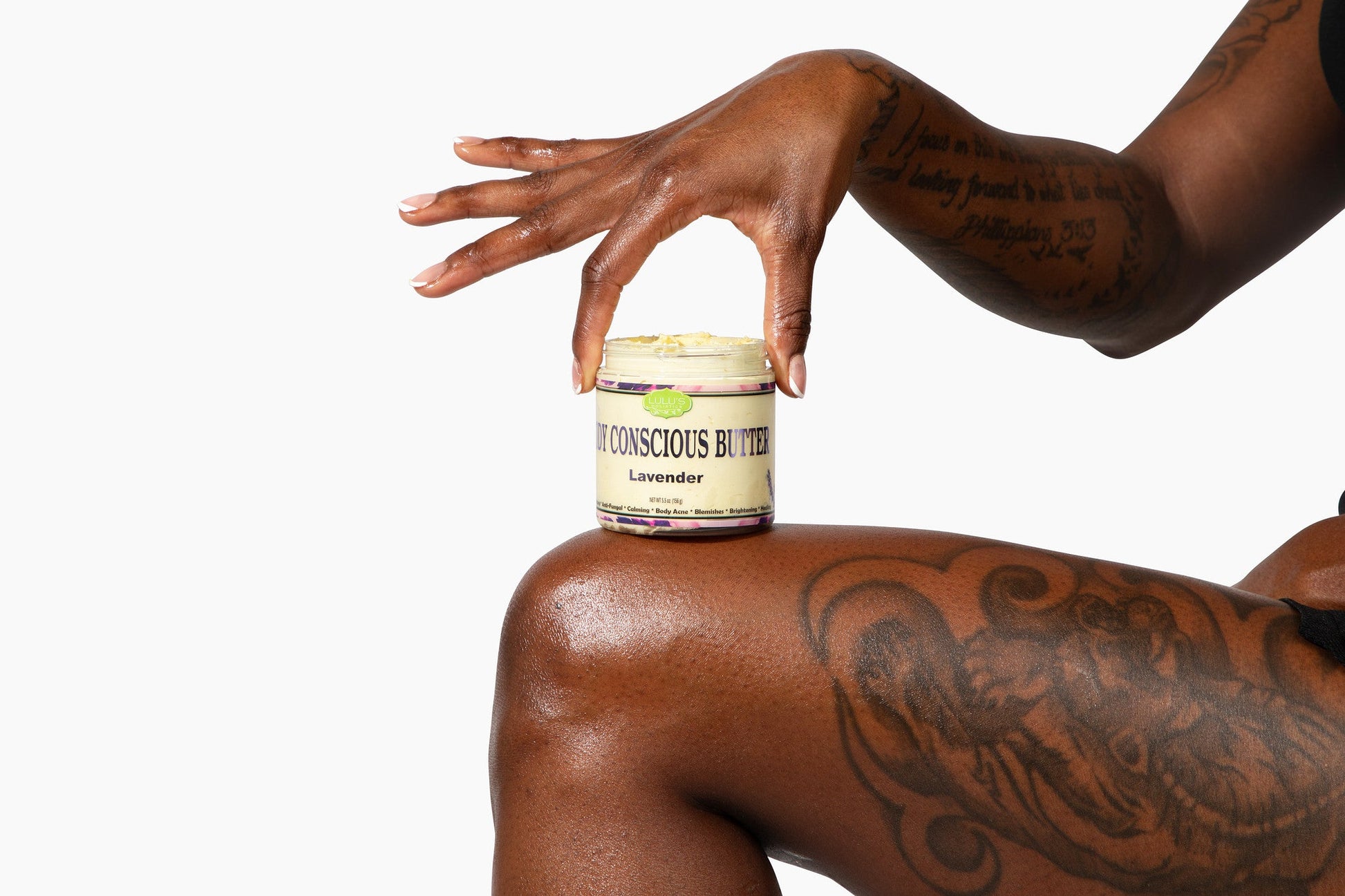 Discover the rejuvenating power of our Lavender Conscious Body Butter. This luxurious cream provides intense hydration, nourishing your skin for a radiant glow. Enhanced with lavender essence, it offers a calming aroma while promoting skin healing and reducing inflammation. Packed with antioxidants, it fights off environmental stressors, slows aging signs, and brightens your complexion. Make it an essential part of your daily skincare ritual for healthy, beautiful skin.