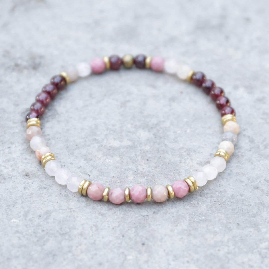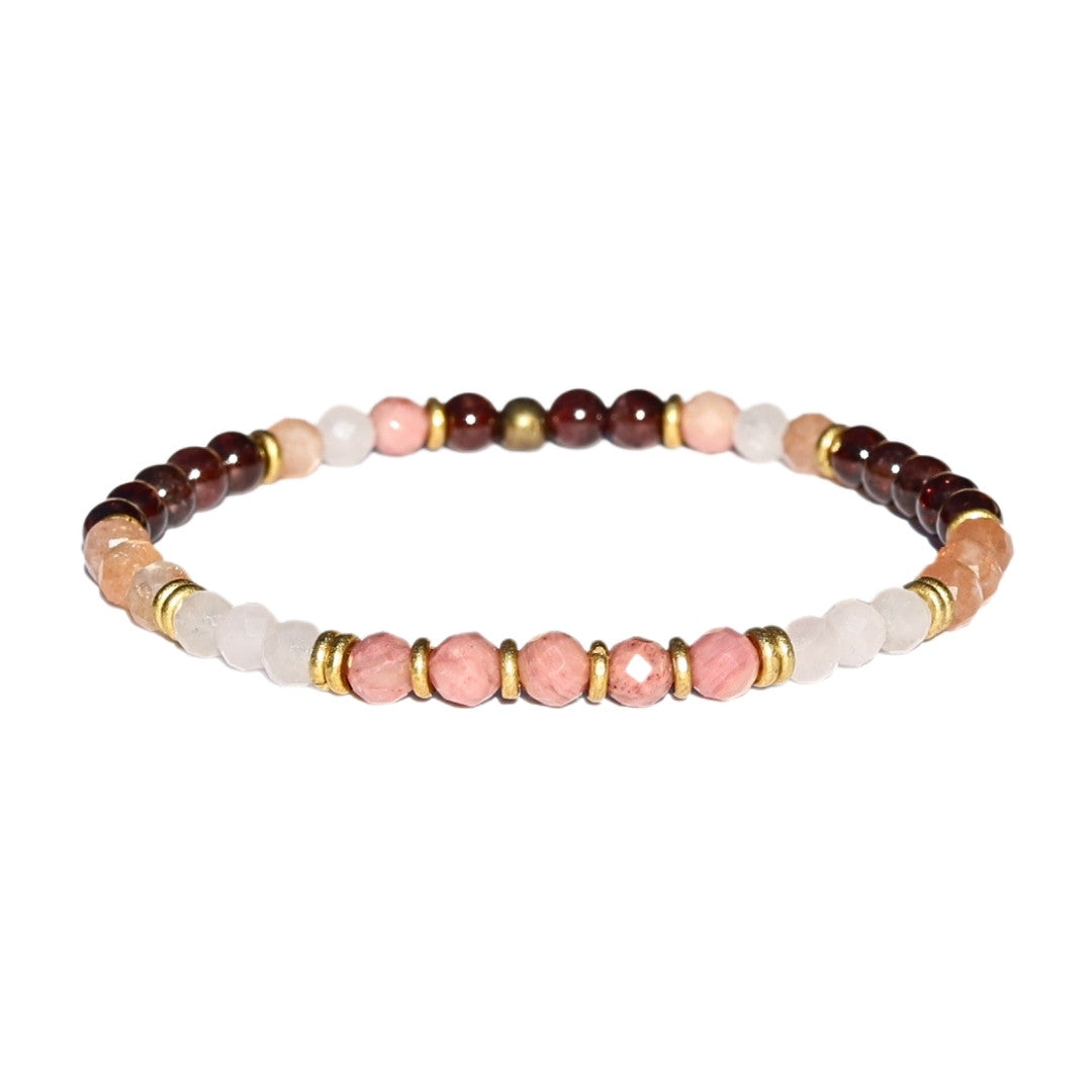 - Dainty gemstone bracelet made with garnet, sunstone, and rose quartz.