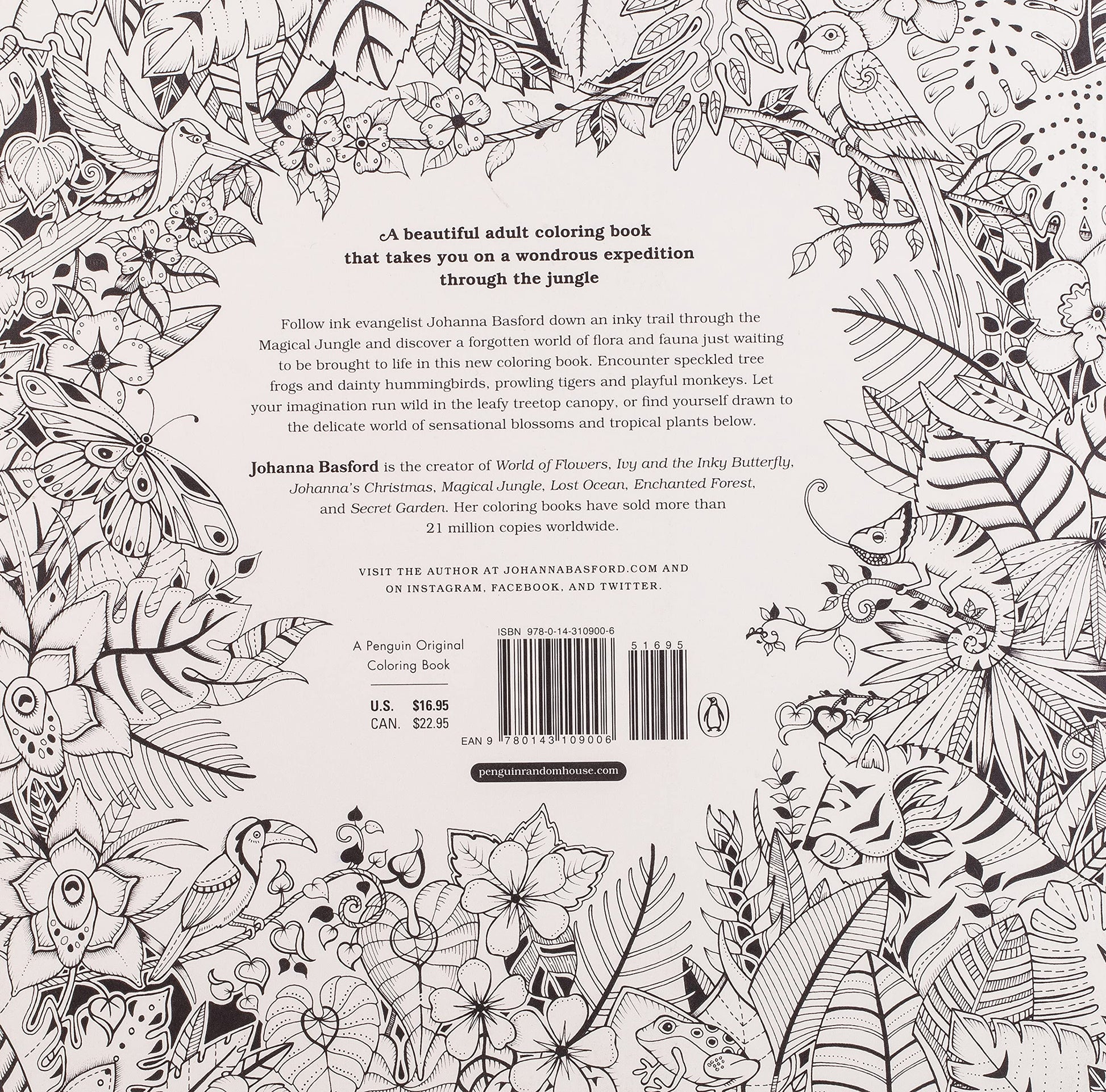 Follow ink evangelist Johanna Basford down an inky trail through the Magical Jungle and discover a forgotten world of flora and fauna just waiting to be colored in this new coloring book for adults. Through intricate pen and ink illustrations, color-inners of all ages are invited to explore an exotic rainforest teeming with creatures large and small. Encounter speckled tree frogs and dainty hummingbirds, prowling tigers and playful monkeys. Let your imagination run wild in the leafy treetop canopy or find yourself drawn to the delicate world of sensational blossoms and tropical plants below.