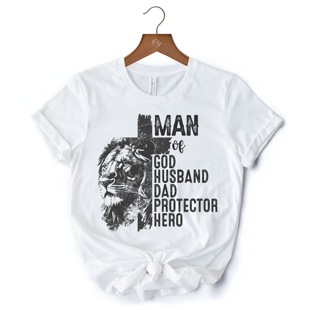 Man of God Lion Cross T-Shirt, White Tee for Faithful and Christian Fathers