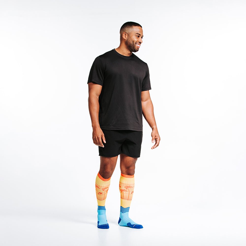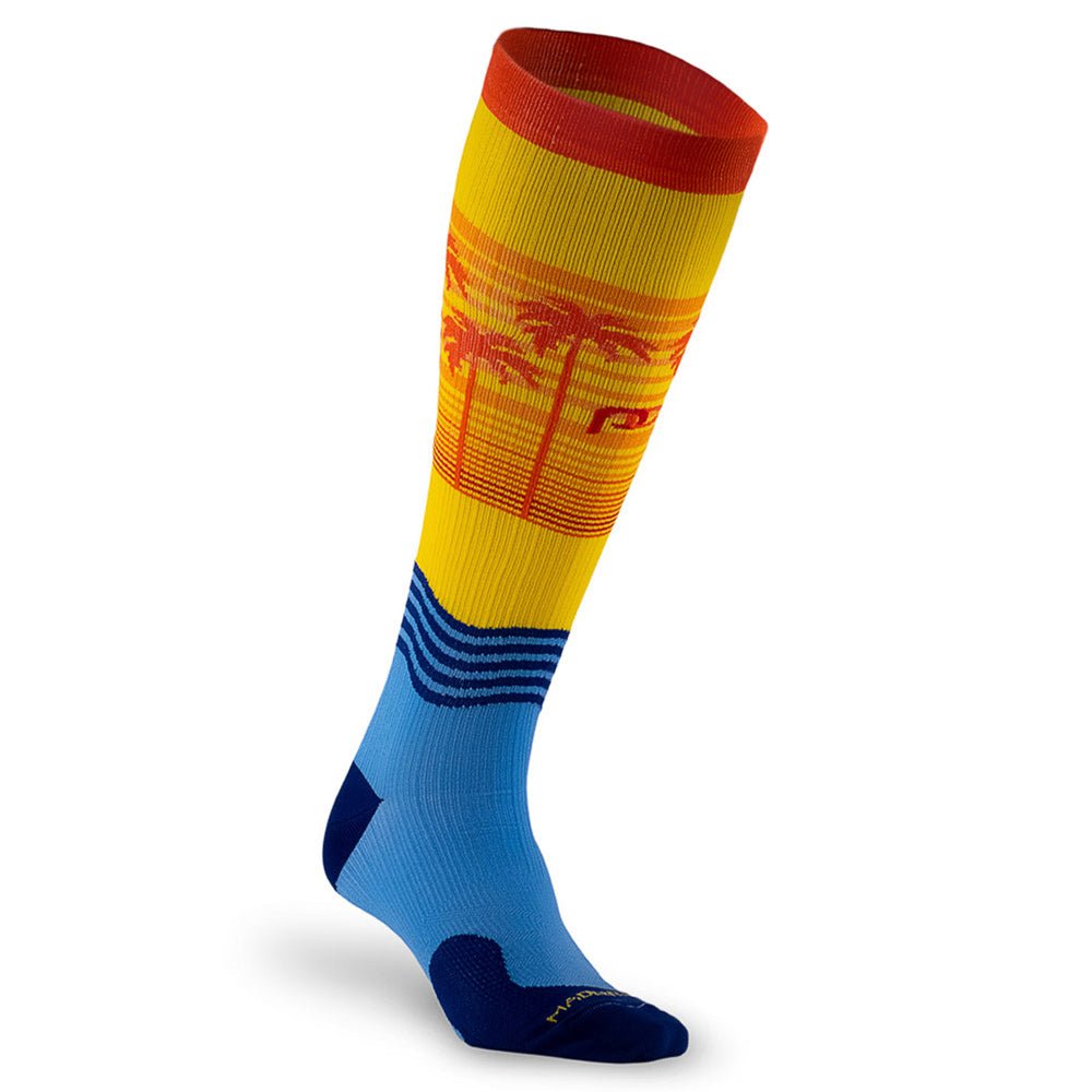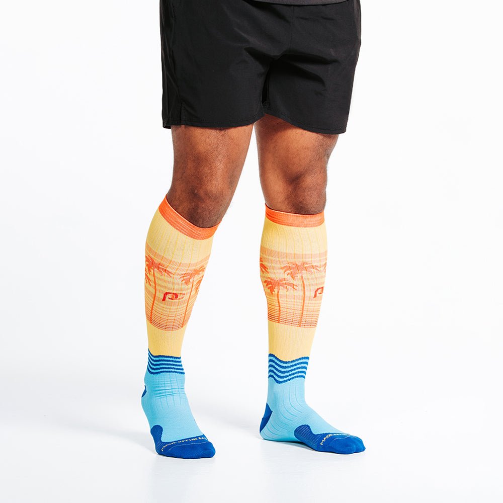Live like a San Diego local from anywhere with compression knee-high socks showcasing palm trees, sand, and ocean against the classic backdrop of a Southern California sunset. Surf's up! Get yours before the waves are gone!