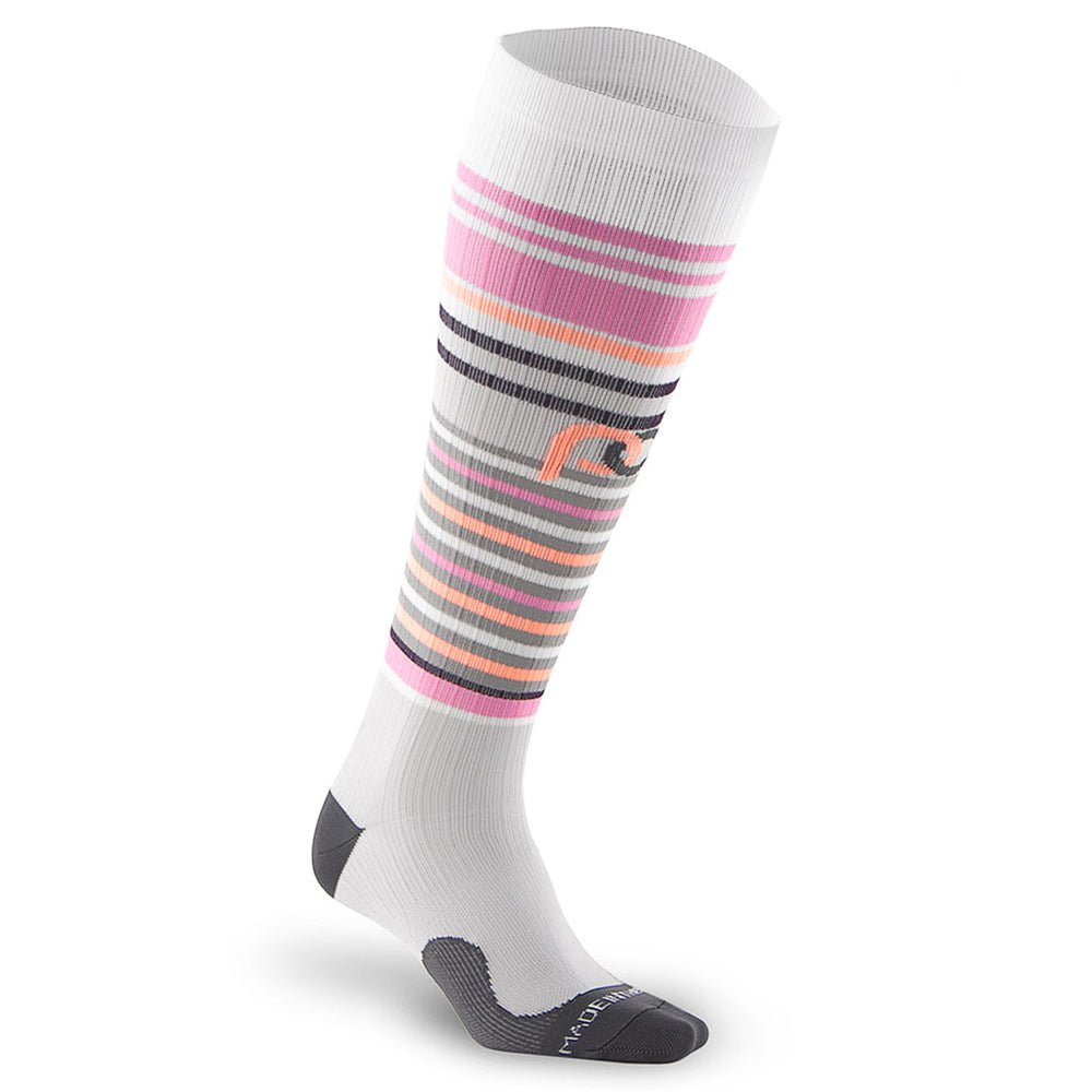 These white compression knee-high socks are accented with white, pink, black, and grey calf stripes along with black toe and heel boxes.