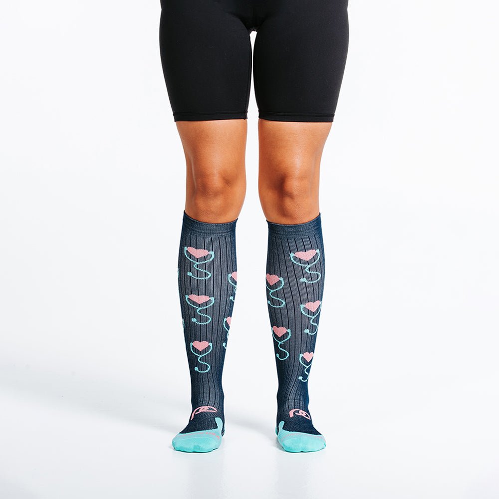 A top-seller for nurses, these knee-high compression socks are classic navy blue color gilded with a cheerful stethoscope and pink hearts pattern.