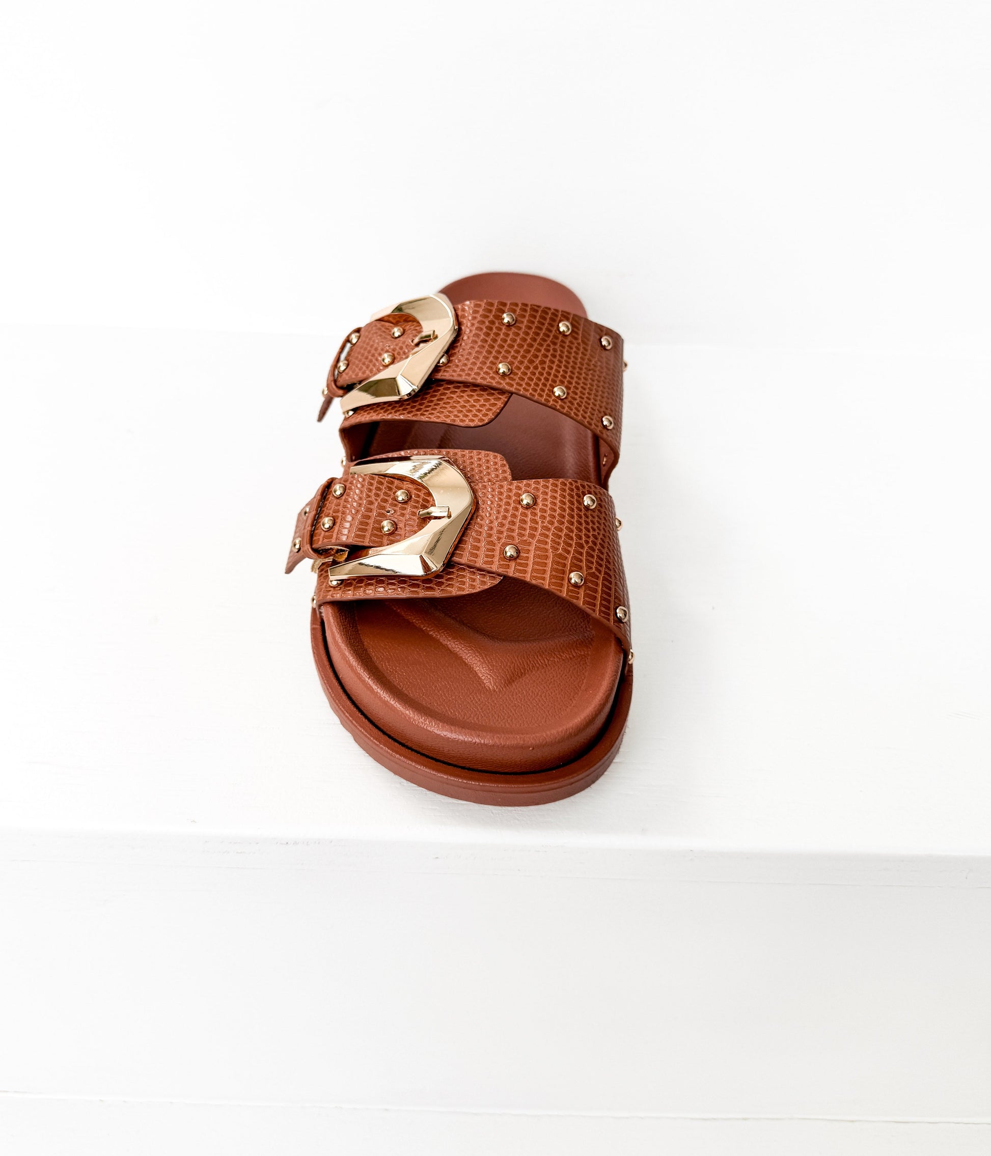 Easy, comfortable, and just the right amount of polished. These cream studded slide sandals are the kind you’ll reach for all season long. The embossed faux leather upper adds subtle texture, while the gold buckle details and stud accents give them a little personality without feeling overdone.