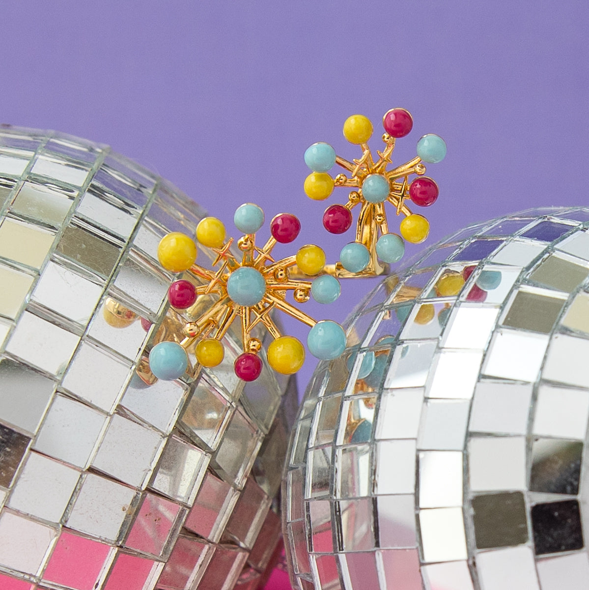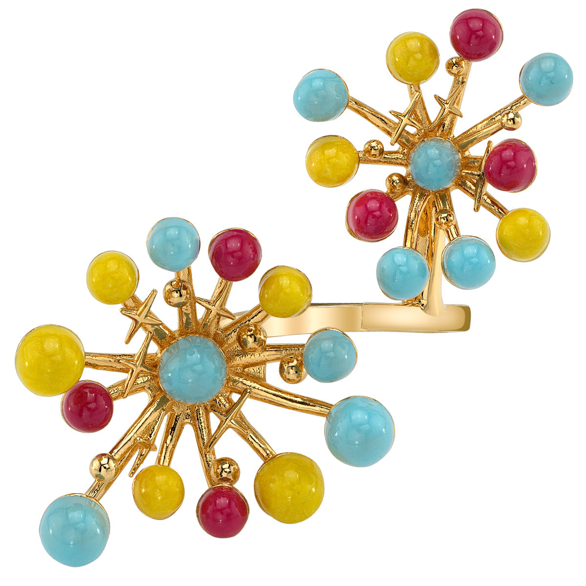 The dynamic design features playful, round enamel spheres that capture her signature pyrotechnic powers, glowing in vivid magenta pink, sunny yellow, and light blue. Sculpted orbs and stars are artfully arranged among the dynamic, three-dimensional burst shape, polished to a brilliant yellow gold finish. Bold yet lightweight, the kinetic design mirrors Jubilee’s spirited essence, making this adjustable ring an eye-catching centerpiece for any outfit.