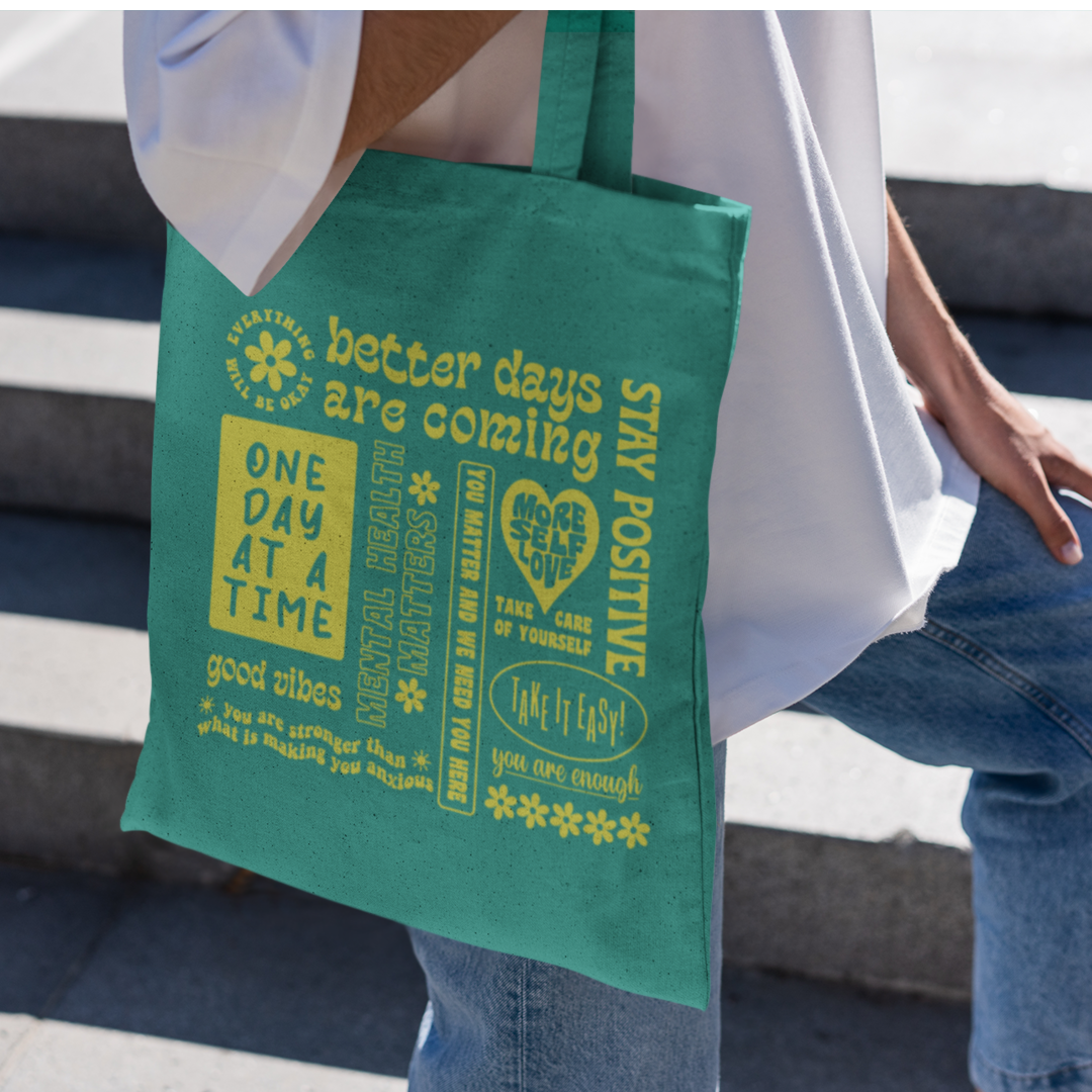 Featuring motivational phrases like "One Day at a Time," "You Matter," and "Stay Positive," this tote is a perfect daily reminder of self-care and resilience. Its spacious and durable design makes it ideal for everyday use, whether you're running errands, heading to the gym, or carrying your favorite books. Made from eco-friendly materials, it's a stylish and sustainable alternative to plastic bags.
