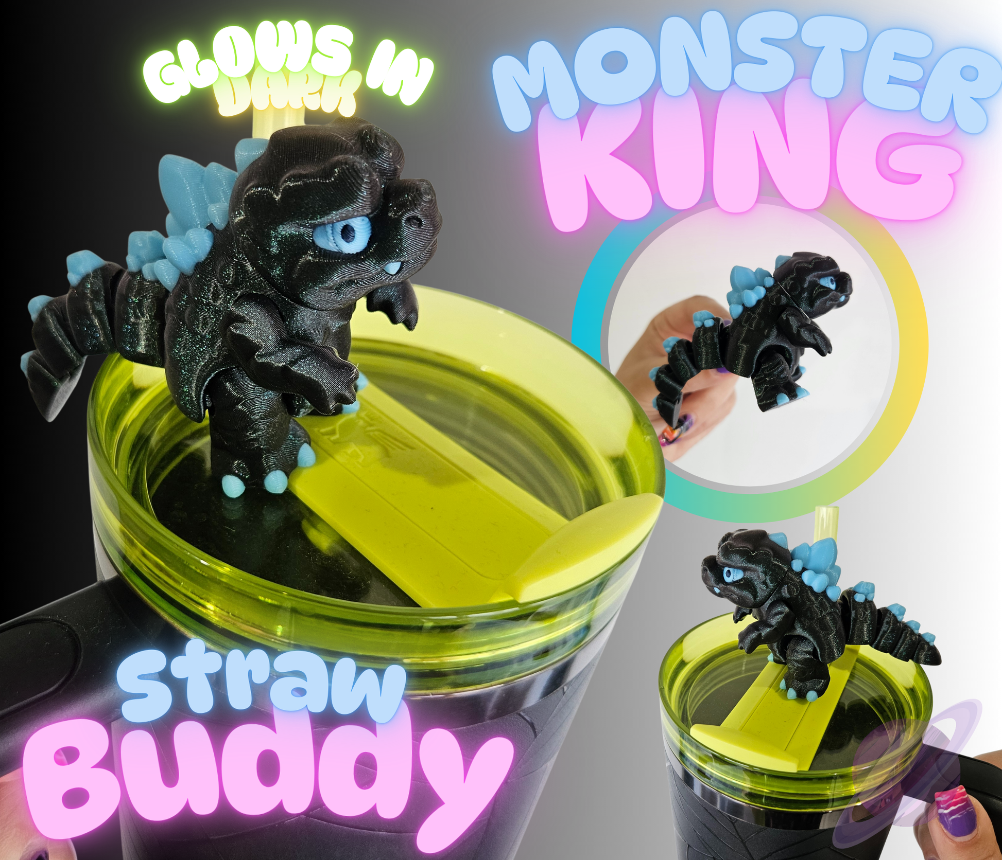MONSTER KING – 3D Printed Straw Buddy – Glows in the Dark 🦖✨