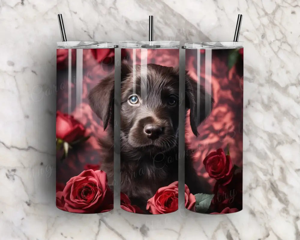 Fall in love with your drinkware with My Heart Loves - Multi. This adorable tumbler features a black puppy surrounded by vibrant red roses. Perfect for animal lovers and those who appreciate a touch of whimsy in their daily routine. Sip with love!