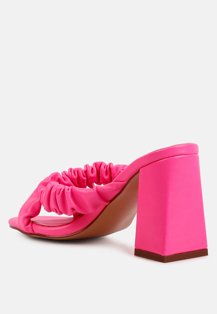 These cross-strap trendy heels are designed in a gathered scrunchie style using faux leather. They boast a wide block heel that provides comfort and stability. Crafted with exceptional craftsmanship and a superb finish, this pair is a staple for years to come!