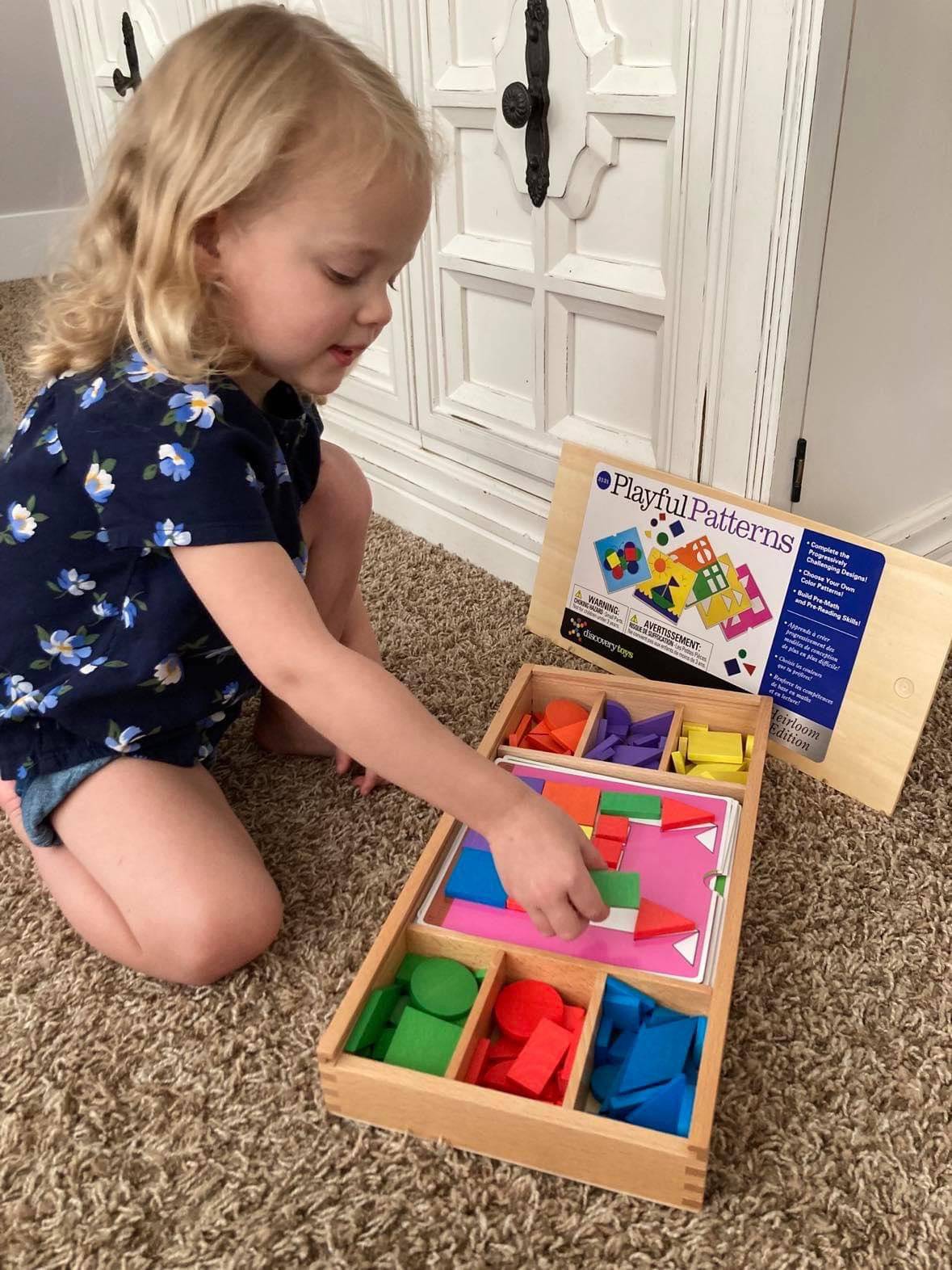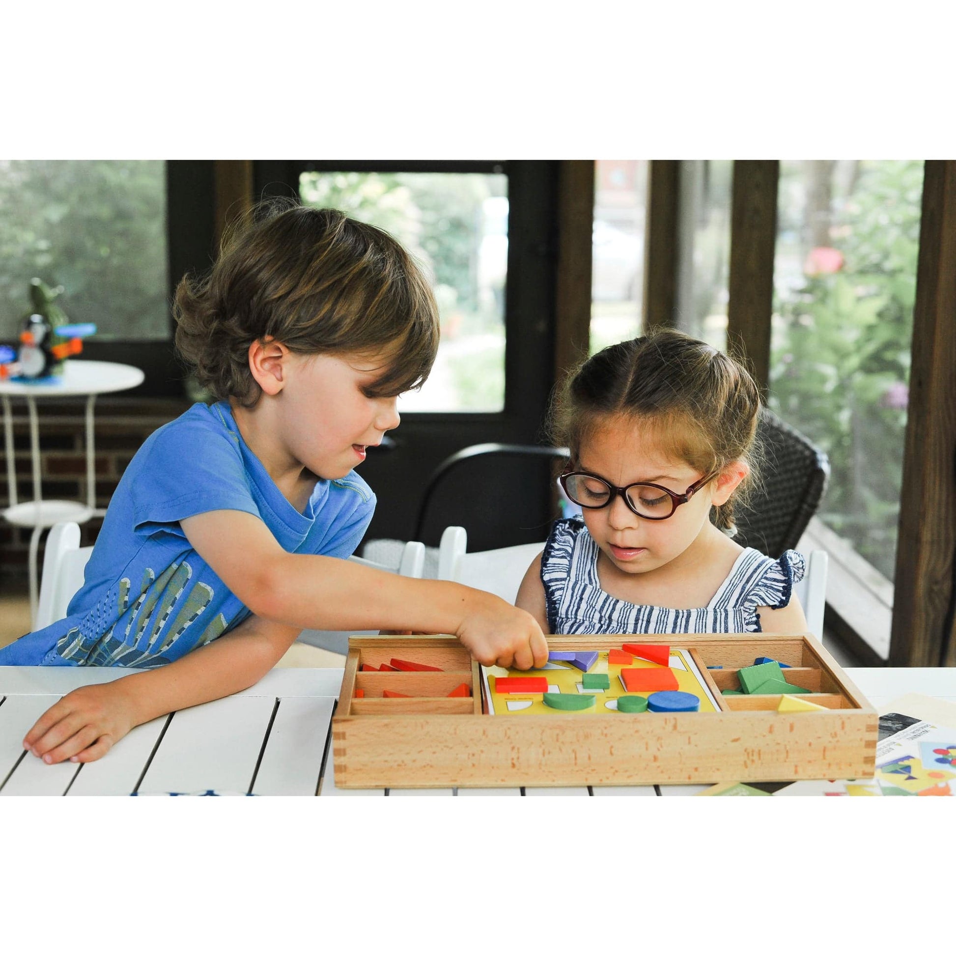 An early childhood pre-math and pre-reading Montessori learning center in an heirloom wooden box, made of durable eco-friendly materials. Logic and spatial thinking will blossom with the 132 wooden geometric shapes and 34 progressively challenging designs. Match the design cards or create your own open-ended patterns and images. Box can double as self-contained work space. More activities included. Box and shapes made of beech wood and water-based paints. Labels and pattern cards printed with soy based inks. 132 shapes, 20 two-sided cards, 15.5 x 7.8 x 2” storage box. Pattern cards and instructions trilingual (English, French, Spanish). dt exclusive.
