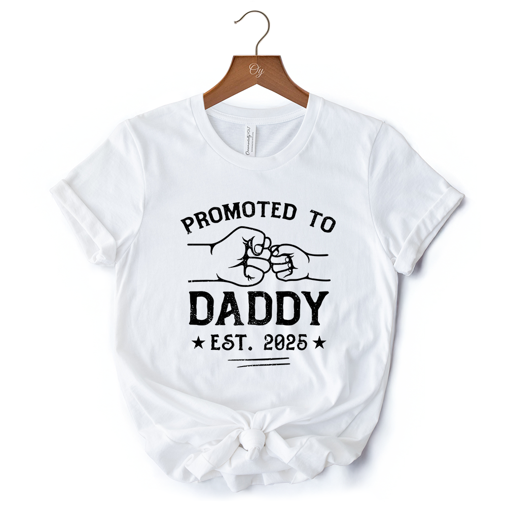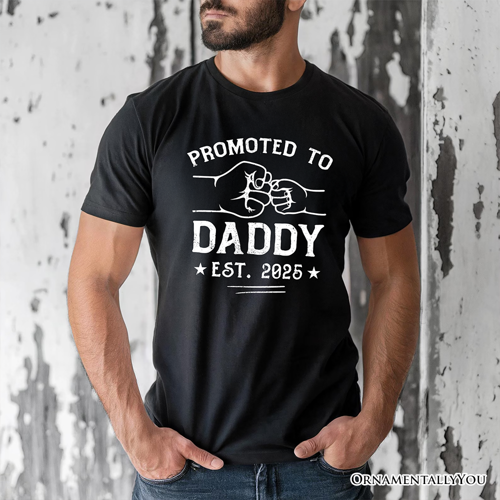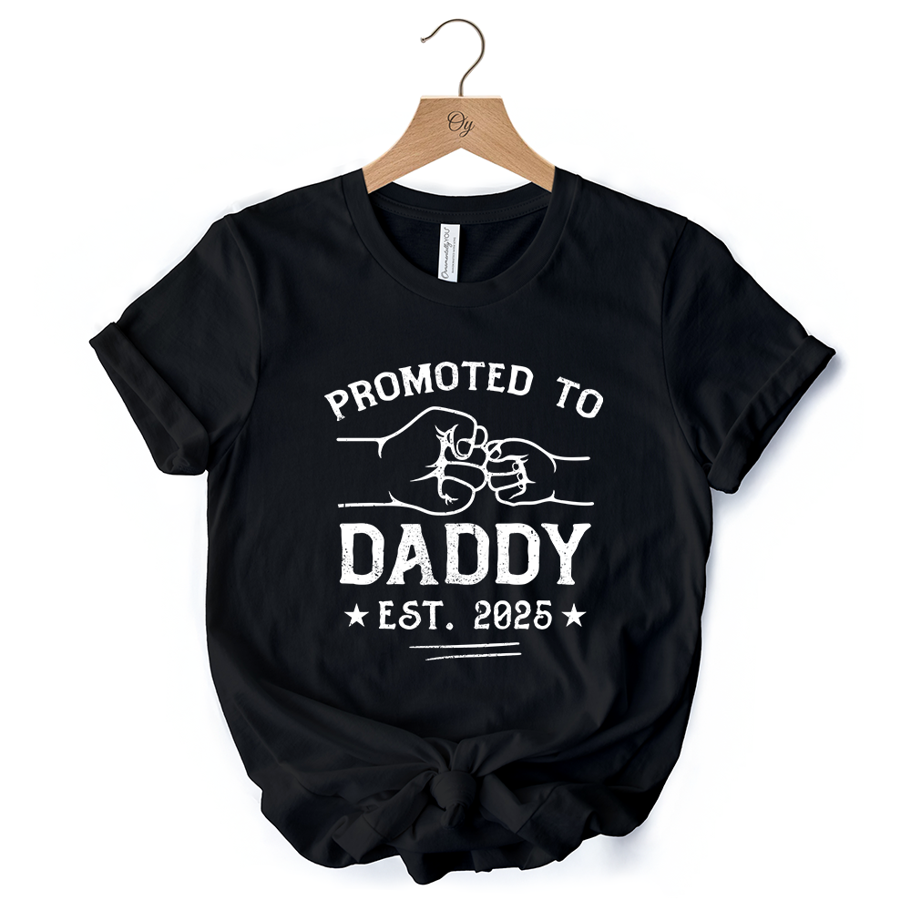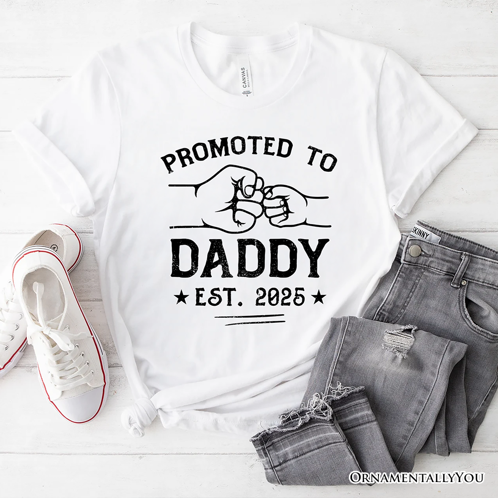 Promoted to Daddy Est. 2025 T-Shirt, Black and White New Dad Pregnancy Announcement Tee