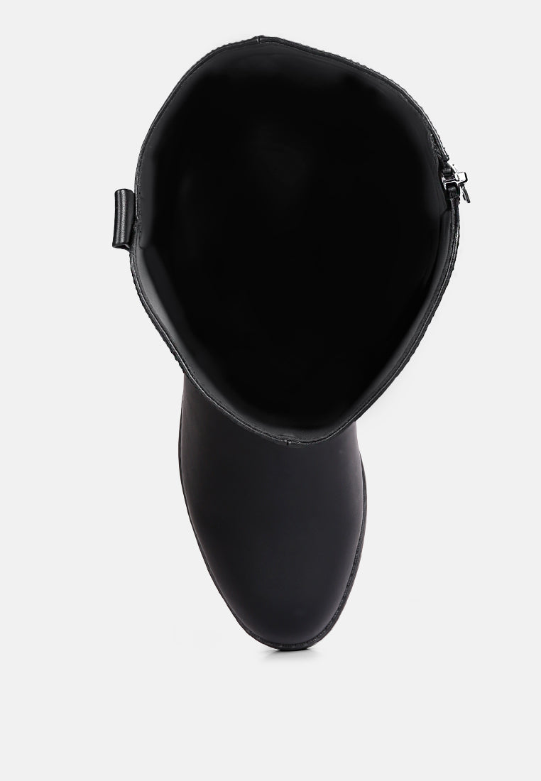 The buckle-embellished boots are edgy and chic with an accentuating gold sling detail on the heel, accentuating the heeled boots' aesthetics. The boots are sure to make a bold statement and are comfortable to wear with soft padded insoles.
