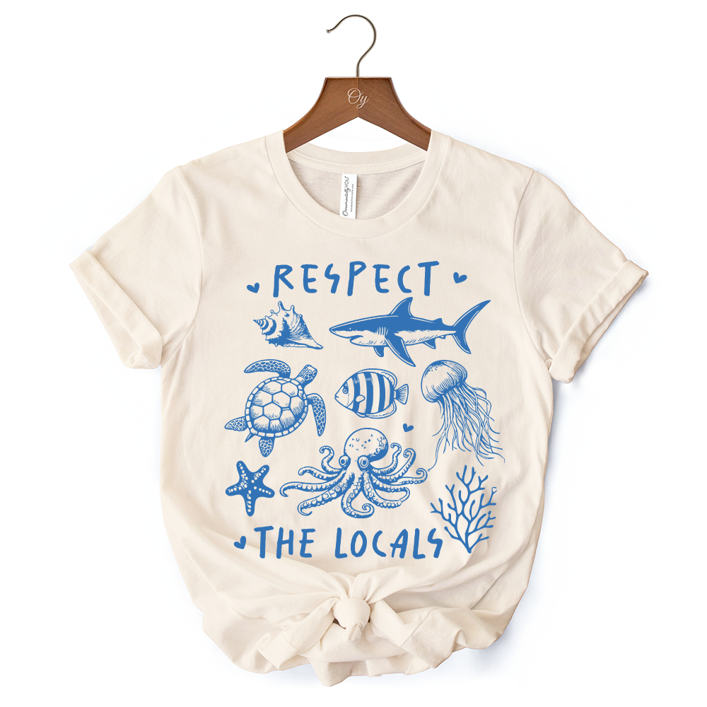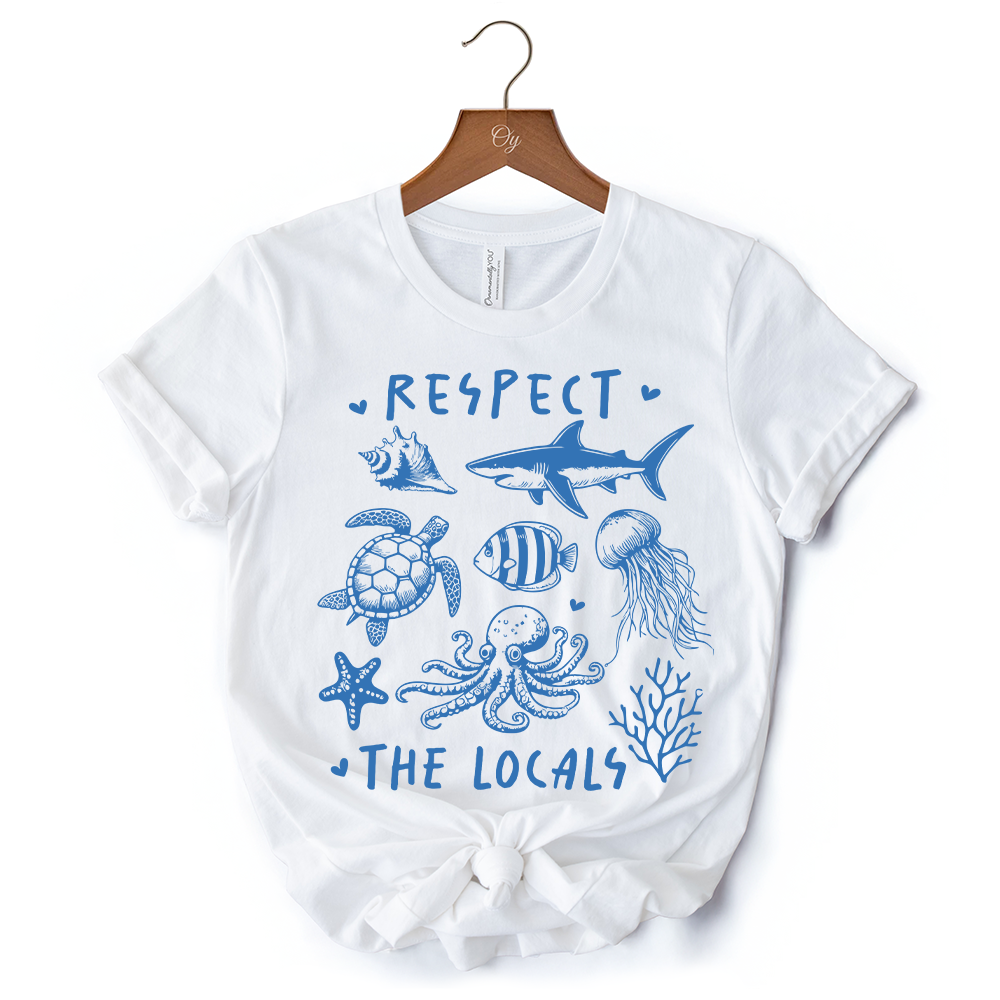 Respect the Locals Ocean Animals T-Shirt, Cute White and Natural Vacation Tee