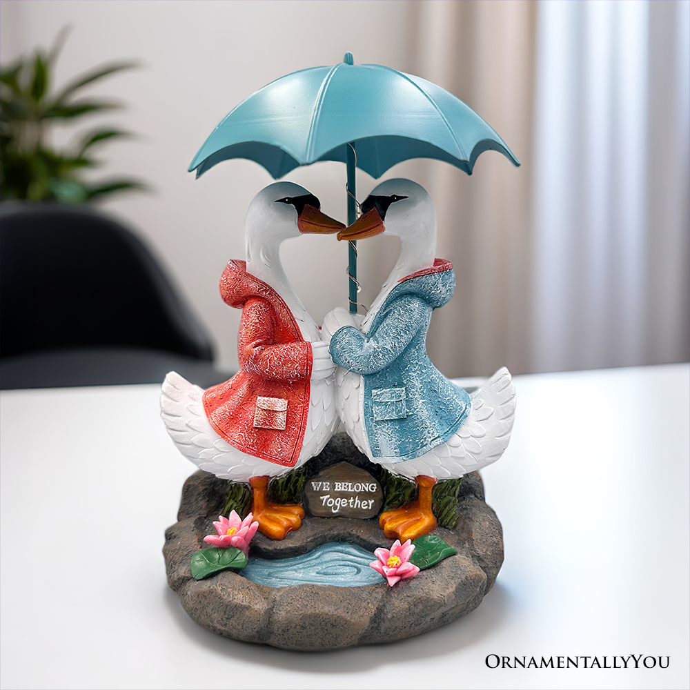 Romantic Swan Couple Under an Umbrella Solar Powered Garden Statue, 10" Lighted Outdoor Bird Figurine Decor