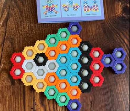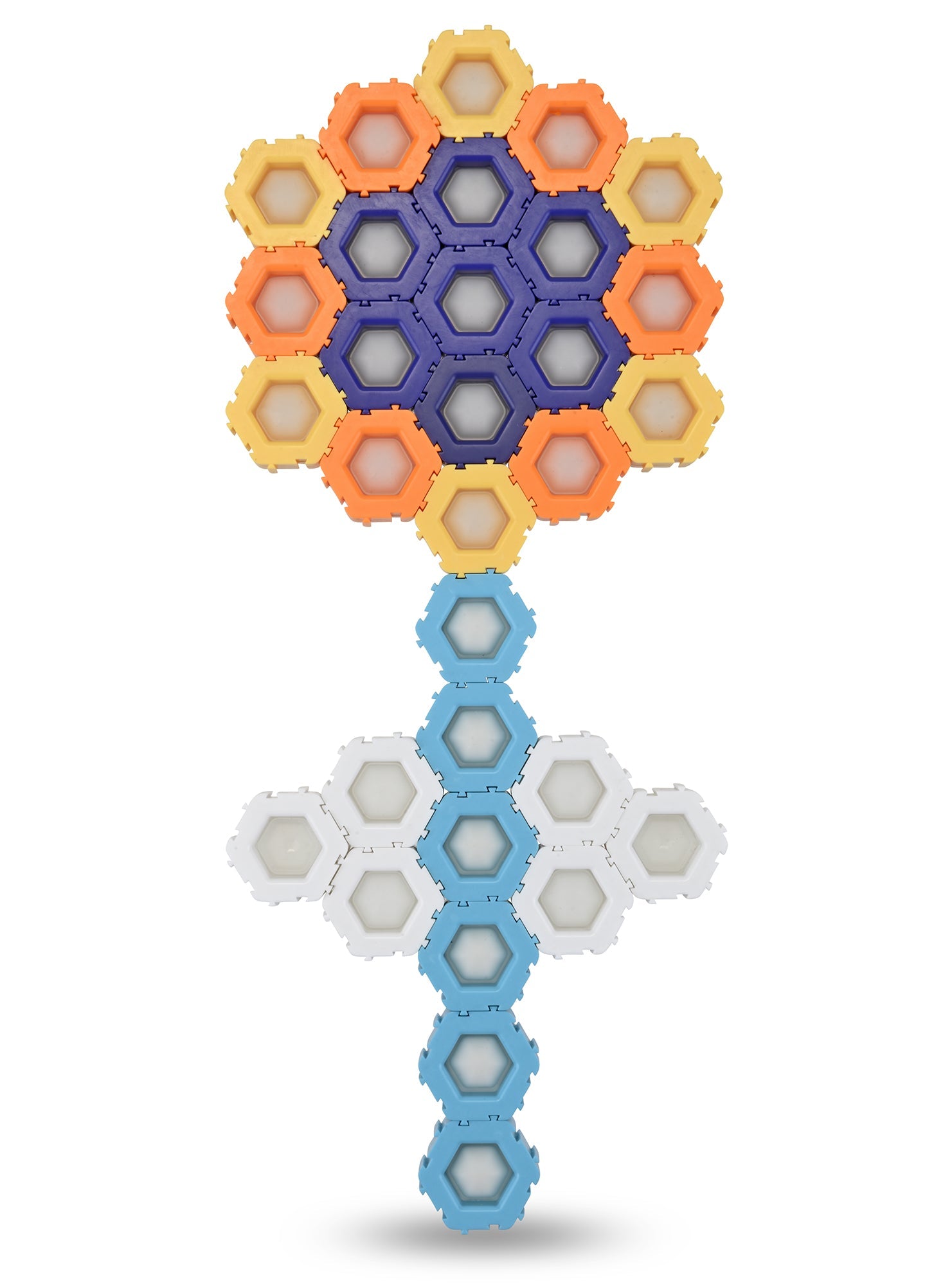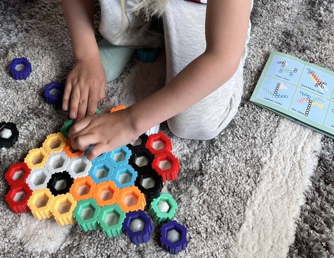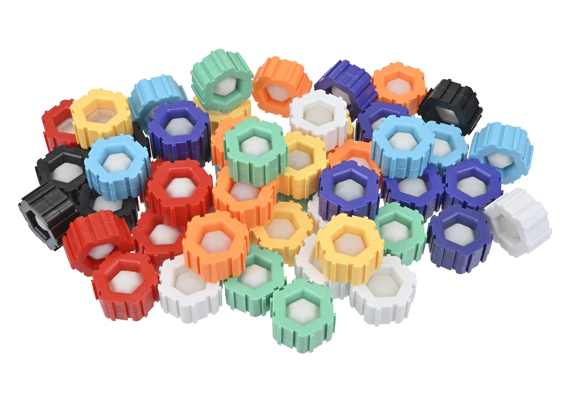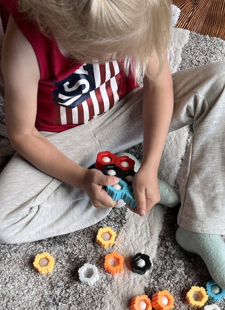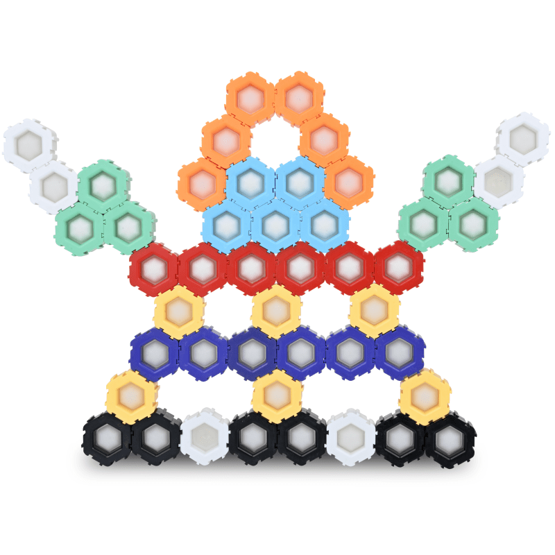These 50 hexagon-shaped blocks each include a poppable bubble center for extra sensory & motor engagement. Connect the blocks by sliding them together in various configurations. The chunky blocks can stand upright, allowing for vertical constructions.