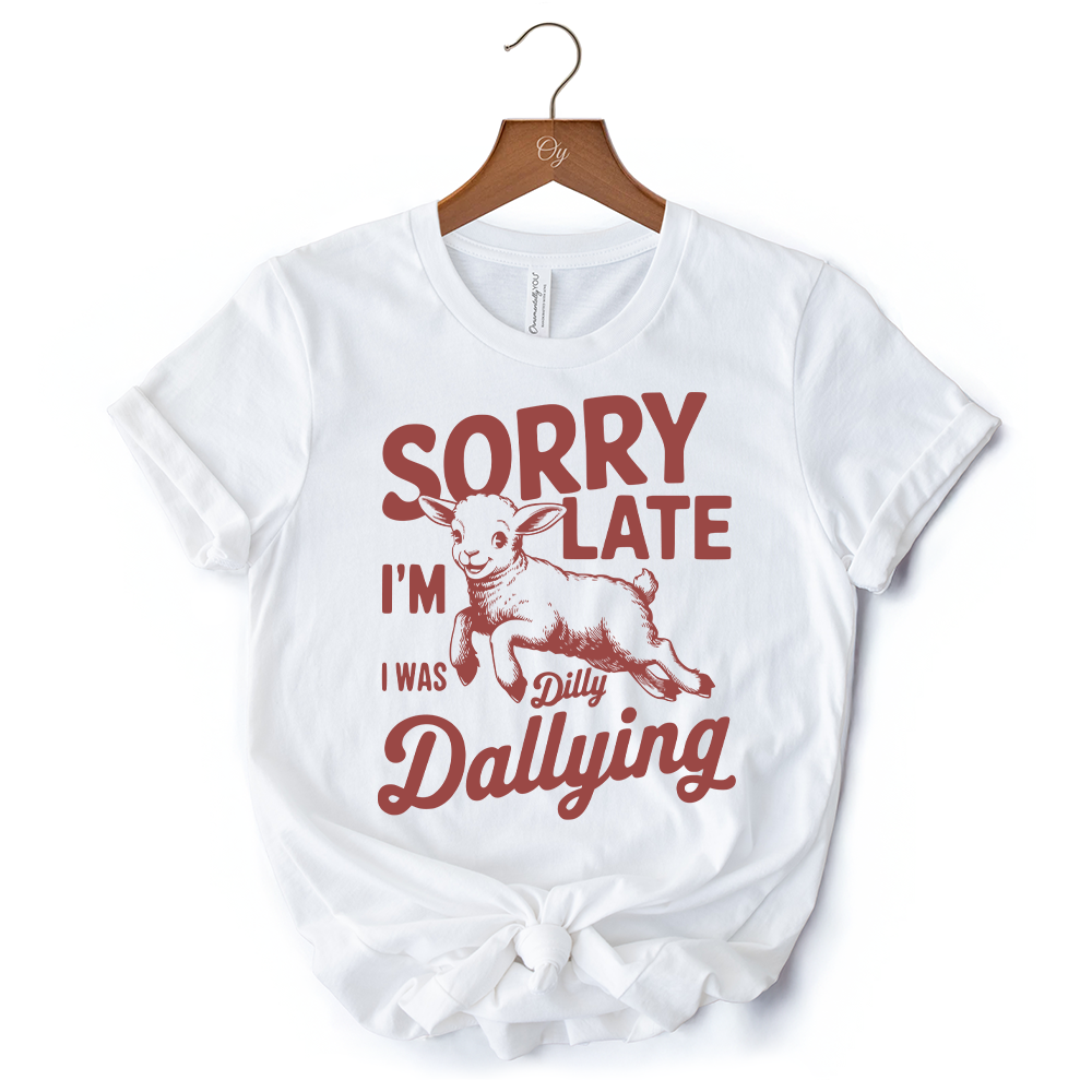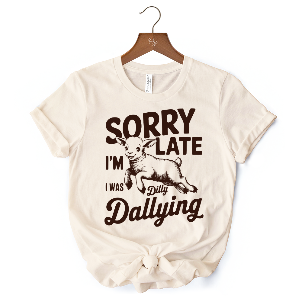 Sorry I'm Late Funny Lamb T-Shirt, Retro Dilly Dallying White and Natural Tee for Quirky Women