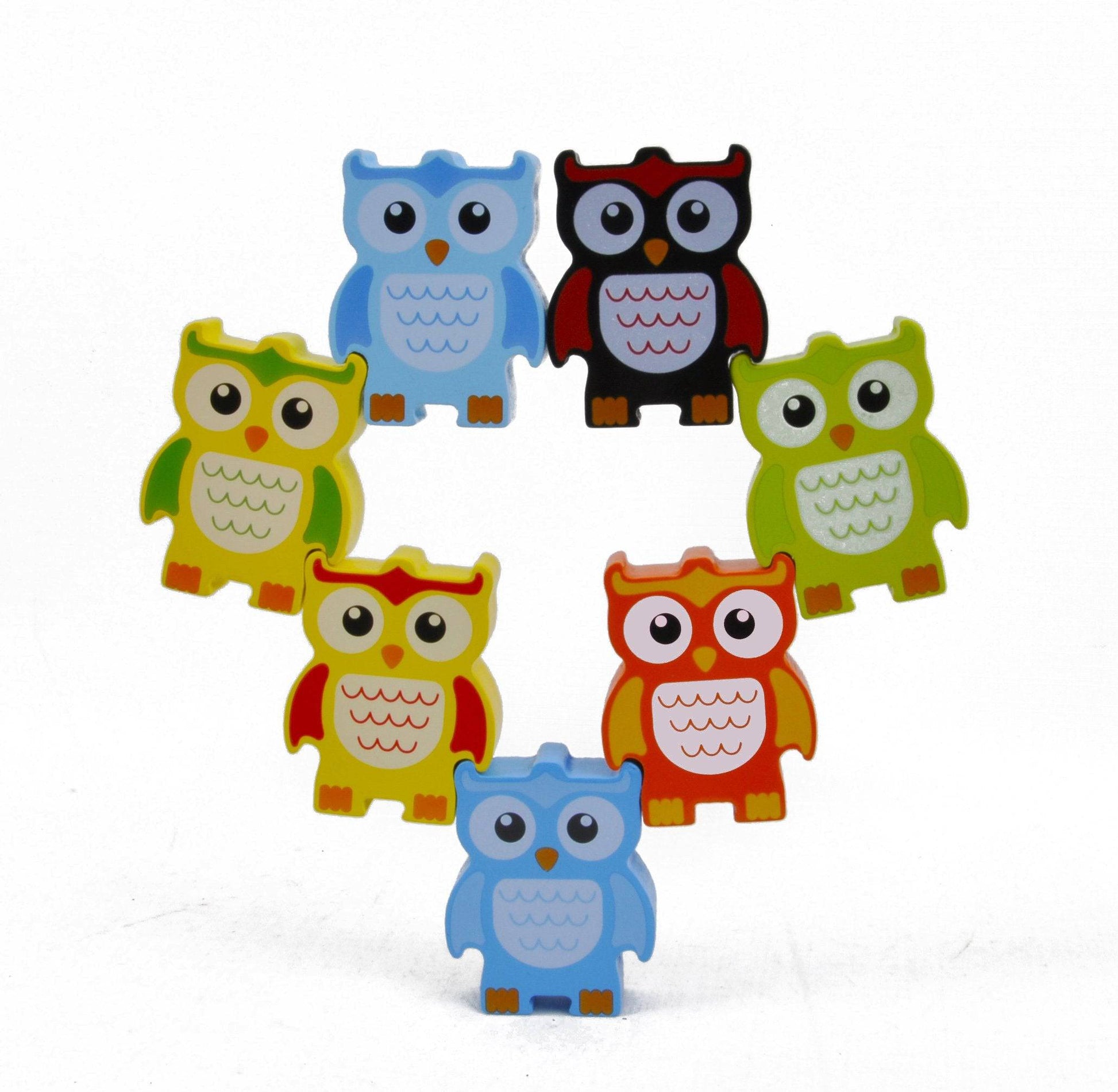 With multiple ways to connect, these chunky Montessori wooden figures can be stacked upright, upside down or even sideways. They can even be balanced on the included parallel bars. Chunky design provides for early success by younger stackers. The owls are numbered 1-12 on one side for sequential stacking or simple number fun. Activity guide includes multiple ways to play. Includes 12 wood owl figures, 2 wood balance bars, activity guide. dt exclusive.