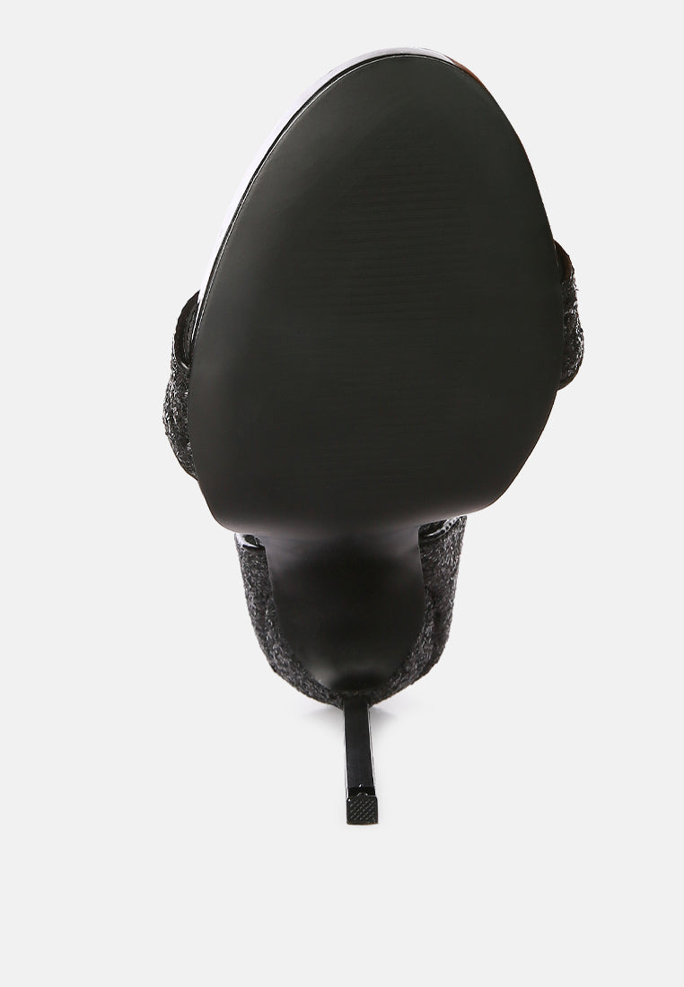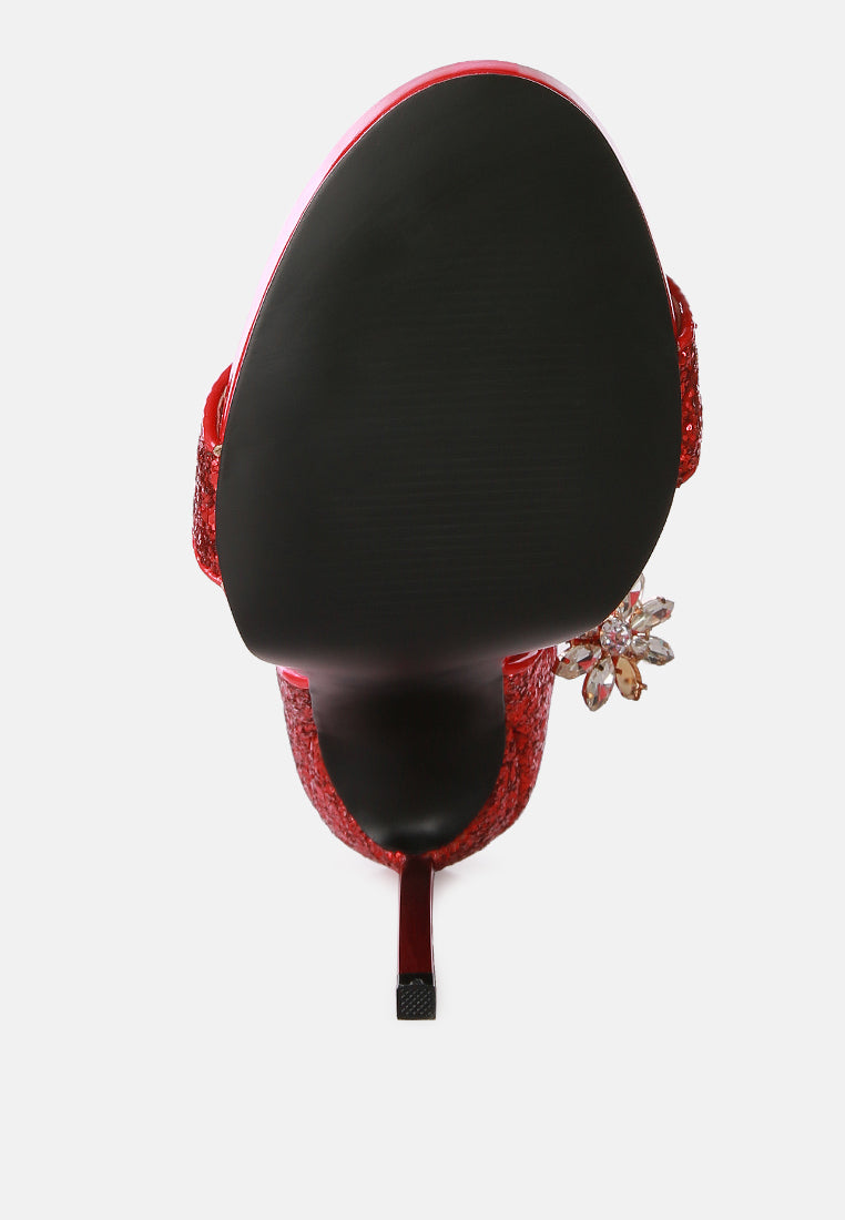With the glam quotient so high, this pair of stiletto party sandals come with floral jewel brooch detailing for you to stand out. The sandals are all glittery, have a pin buckle fastening for a secure fit, and would look stunning at parties, weddings, and any event that needs you to glam up!