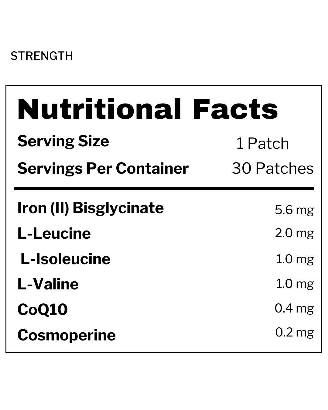 Iron is essential for healthy blood, muscles, and nerve function—fueling your body from the inside out. The Strength Patch delivers highly absorbable Iron (III) Bisglycinate directly into your system, helping maintain energy, endurance, and overall vitality.